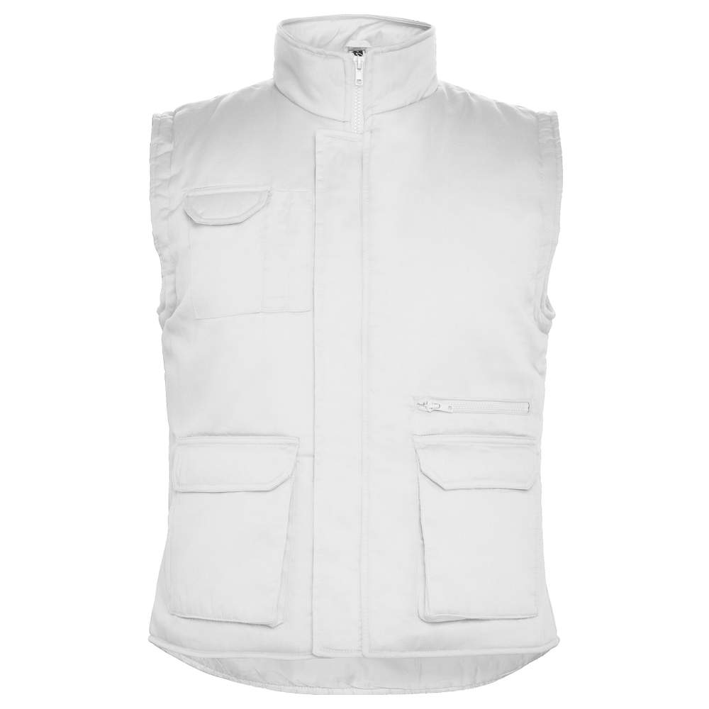Gilet de travail multi-poches à col montant. Zip central avec patte et bande auto agrippante. Une poche extérieure pour portable sur le côté droit. Deux poches avant avec soufflets et ouvertures latérales. Deux emplacements pour stylos. Une poche intérieure avec velcro. Poche zippée. Une poche intérieure avec bande auto agrippante. Bas de vêtement long au dos. Ajusteur avec fermeture automatique. Modèle coupe-vent.