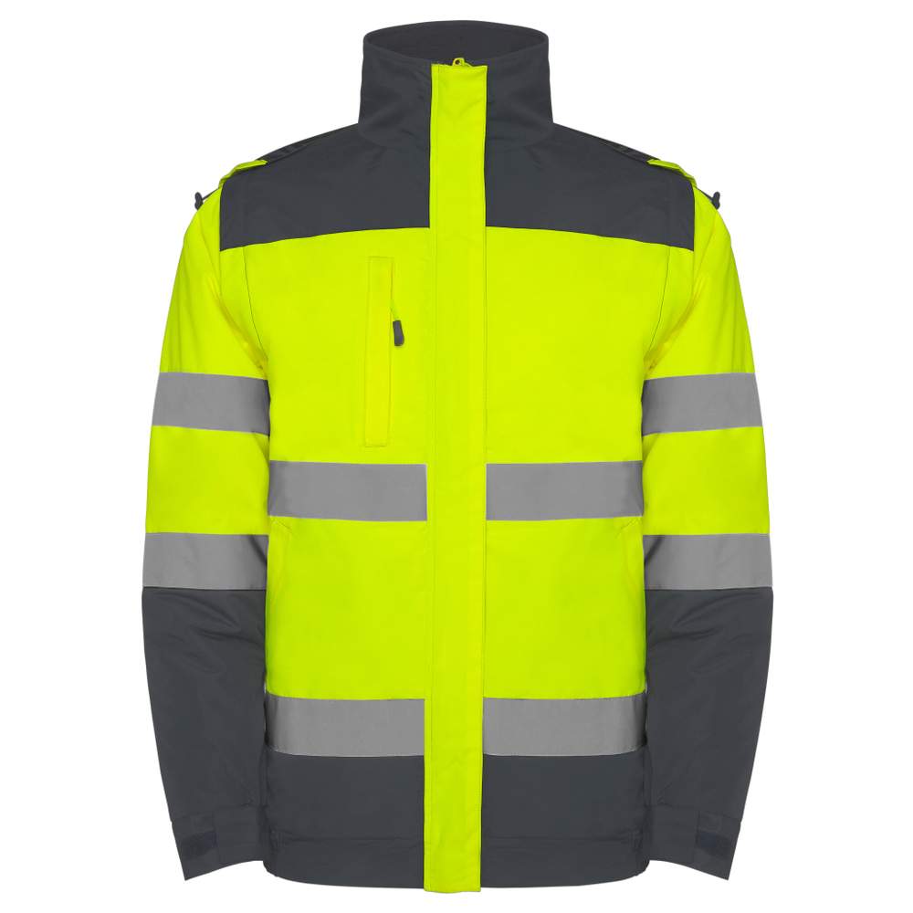 Veste haute visibilité combinée en deux couleurs. Résistante à l'eau et au vent. Deux bandes réfléchissantes sur le corps et les manches. Capuche avec liseré fluo et ajustable avec embouts. Poche en torse avec fermeture zippée. Deux poches frontales légèrement inclinées d'accès facile. Bas avec élastique. Poignets ajustables par élastique et bande auto-agrippante. Accès intérieur pour marquage. Manches amovibles. Certification CE selon les normes EN ISO 13688:2013/A1:2021 EN ISO 20471:2013/A1:2017. Classe II.