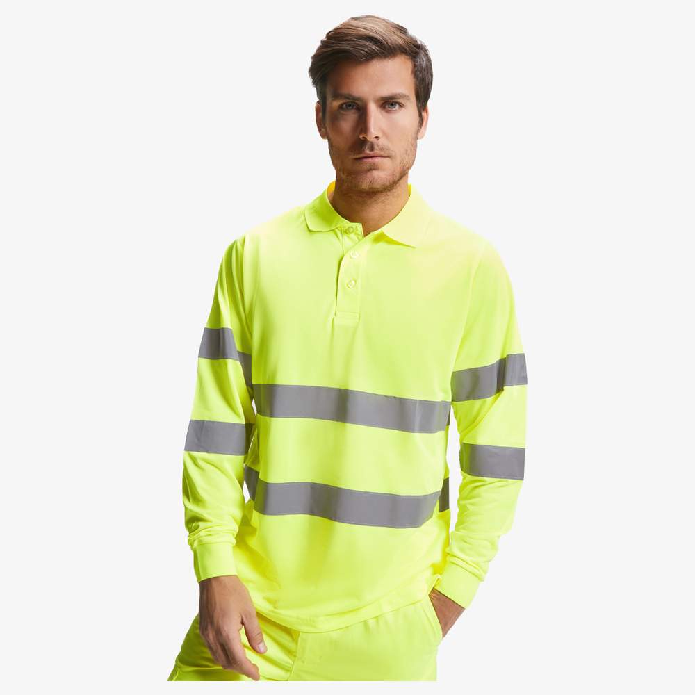 Polo technique manches longues haute visibilité avec deux bandes réfléchissantes sur les manches, sous la poitrine et dans le dos. Patte de boutonnage 3 boutons. Col et poignet en côte 1x1. Tissu anti-accrochage et séchage facile. Poche optionnelle. Certification CE selon les normes : EN ISO 13688:2013/A1:2021EN ISO 20471:2013/A1:2017. Classe II. Étiquette détachable.