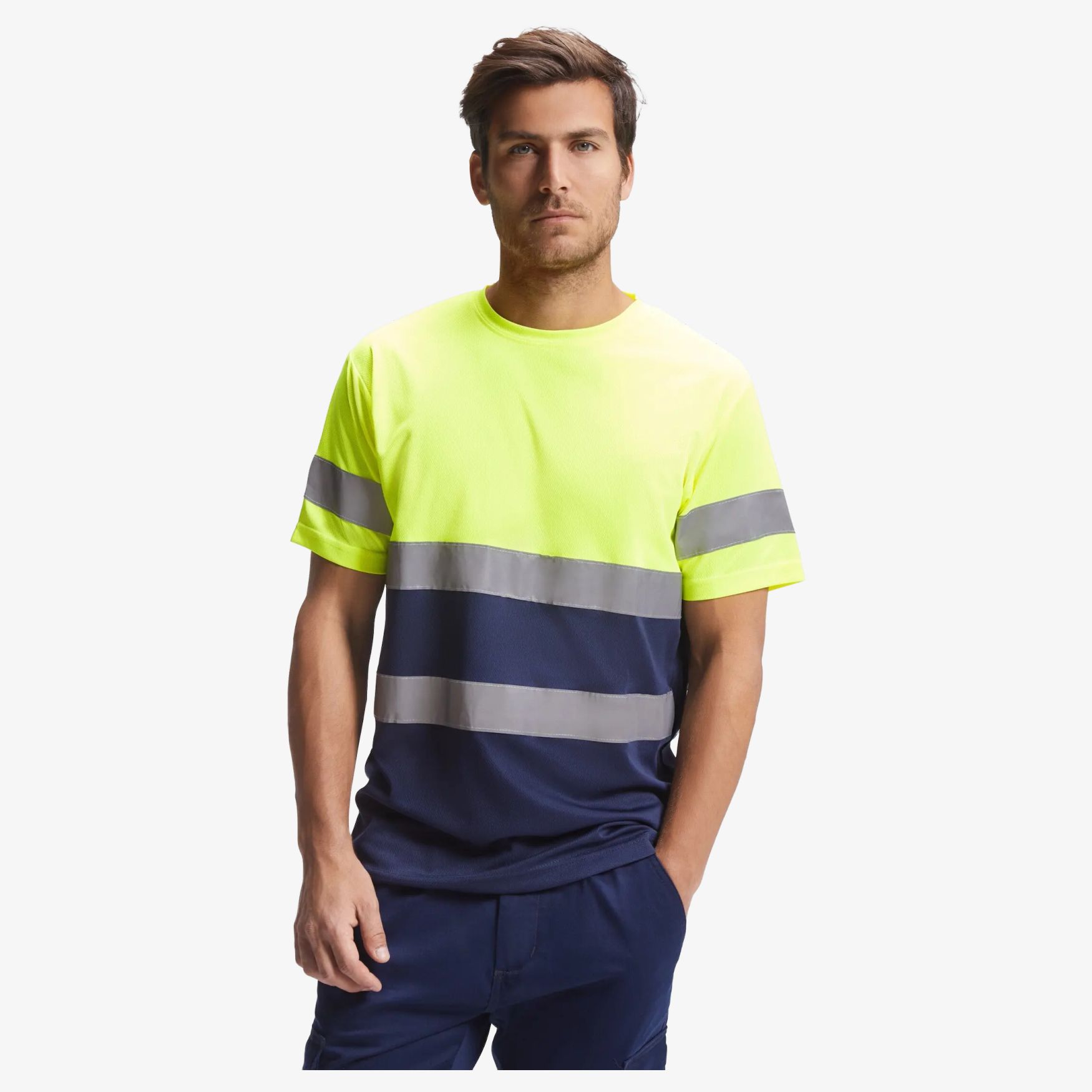 T-shirt technique manches courtes haute visibilité. Col rond avec le même tissu et bande de propreté renforcée à l'intérieur du col. Deux bandes réfléchissantes horizontales sur le torse et une sur les manches. Certification CE selon les normes : EN ISO 13688:2013/A1:2021 EN ISO 20471:2013/A1:2017. Classe I: 55221 - 55223 - 52221 - 23221. Classe II : 221 - 223. Tissu technique. Haute visibilité. Modèle respirant.