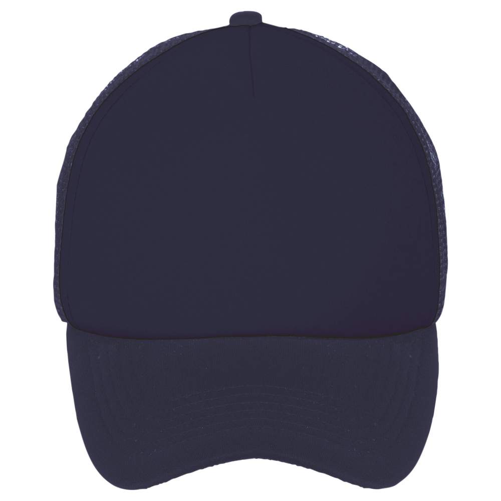 Casquette 5 panneaux en polyester. Panneau avant (mousse 5 mm) et visière (mousse 3 mm) en 100% polyester.