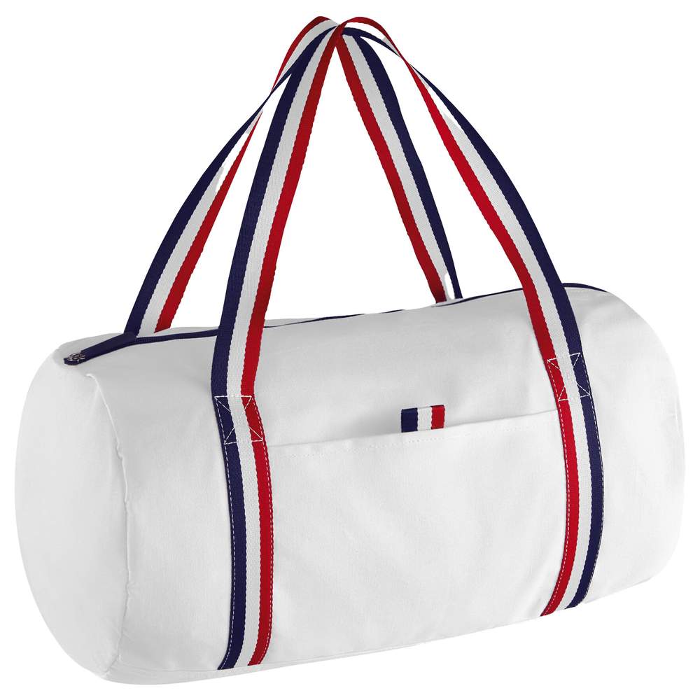 Sac polochon multi-usage. Anses rayées. Grande ouverture avec zip contrasté. 1 poche frontale avec rappel rayé. 1 poche intérieure. Composition : 100% coton.