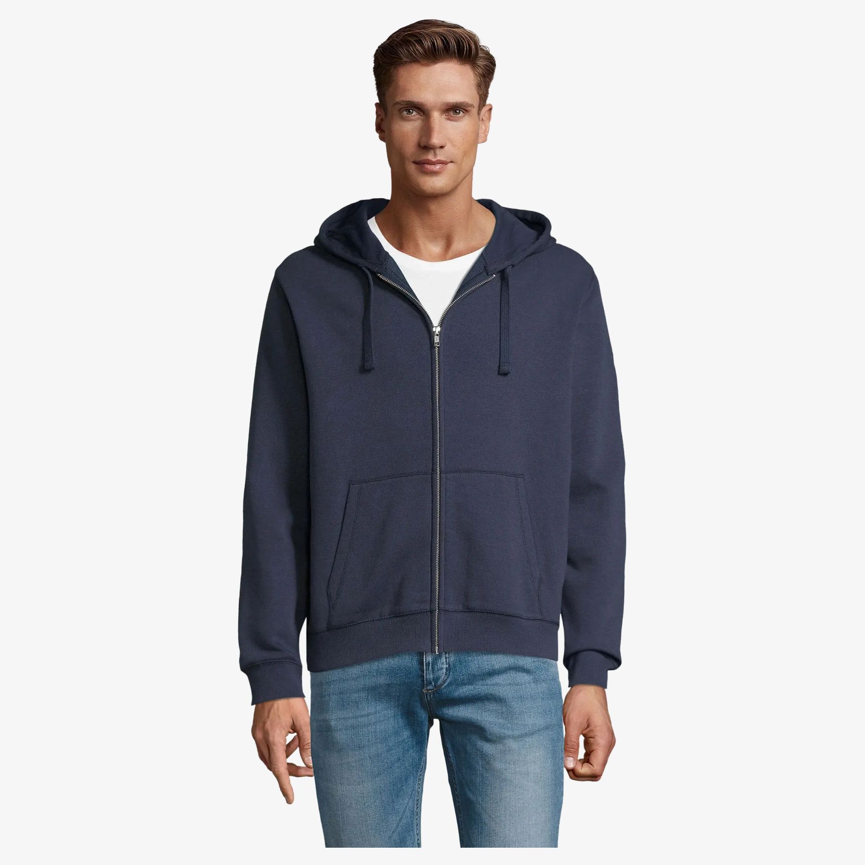 Veste zippée homme à capuche. Manche montées. 2 poches kangourou, coupé cousu. Capuche doublée avec cordon de serrage ton sur ton. Poignets et bas en bord côte 2x2. Demi-lune à l'intérieur du col. Bande de propreté intérieur col. 80% coton Ringspun 20% polyester. Intérieur gratté. Extérieur 100% coton.