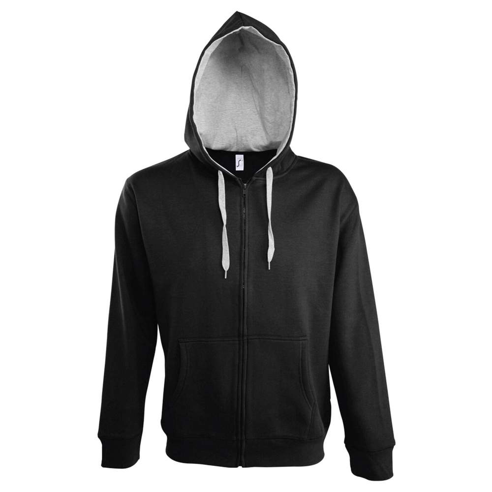 Veste zippée homme bicolore, dotée d'une capuche doublée contrastée. L'intérieur est conçu en molleton gratté pour plus de confort. Elle présente des manches montées et deux poches kangourou pratiques. Les bas et les poignets sont en bord côte élasthanne pour un ajustement optimal. La composition du tissu est un mélange de 50% coton et 50% polyester.