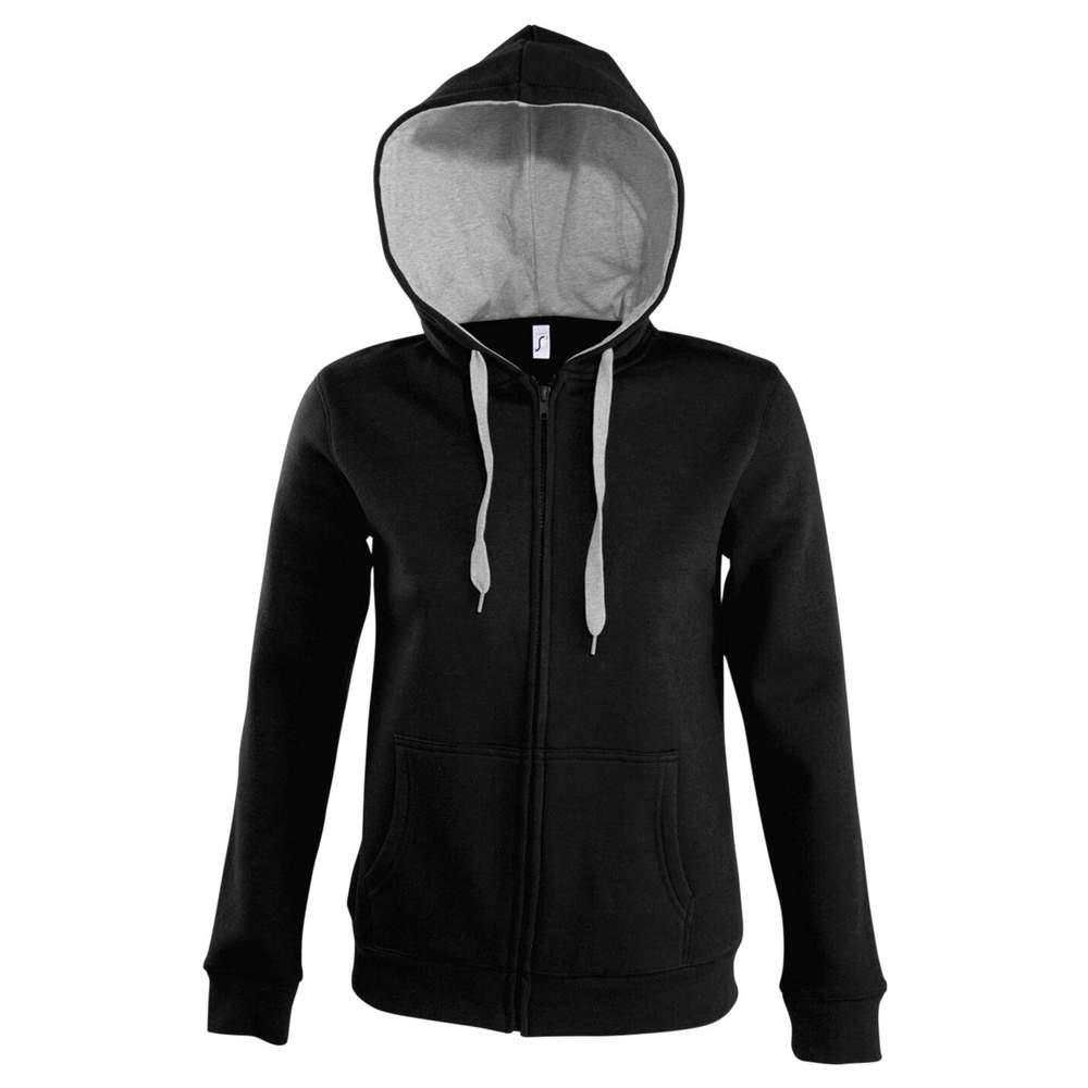 Veste zippée femme bicolore, dotée d'une capuche doublée contrastée. L'intérieur est conçu en molleton gratté pour plus de confort. Elle présente des manches montées et deux poches kangourou pratiques. Le bas et les poignets sont en bord côte élasthanne pour un ajustement optimal. La coupe est ajustée pour une silhouette valorisante.