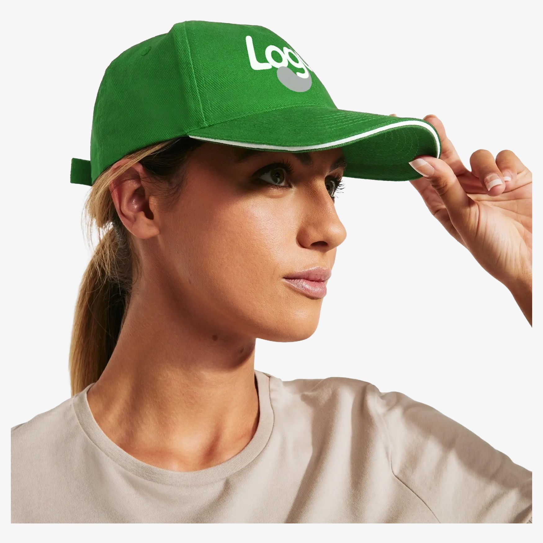 La casquette ERIS est composée de 100 % coton. Elle comprend cinq panneaux avec sandwich contrasté et quatre œillets d'aération brodés. La fermeture est assurée par une bande auto agrippante réglable et une étiquette amovible.