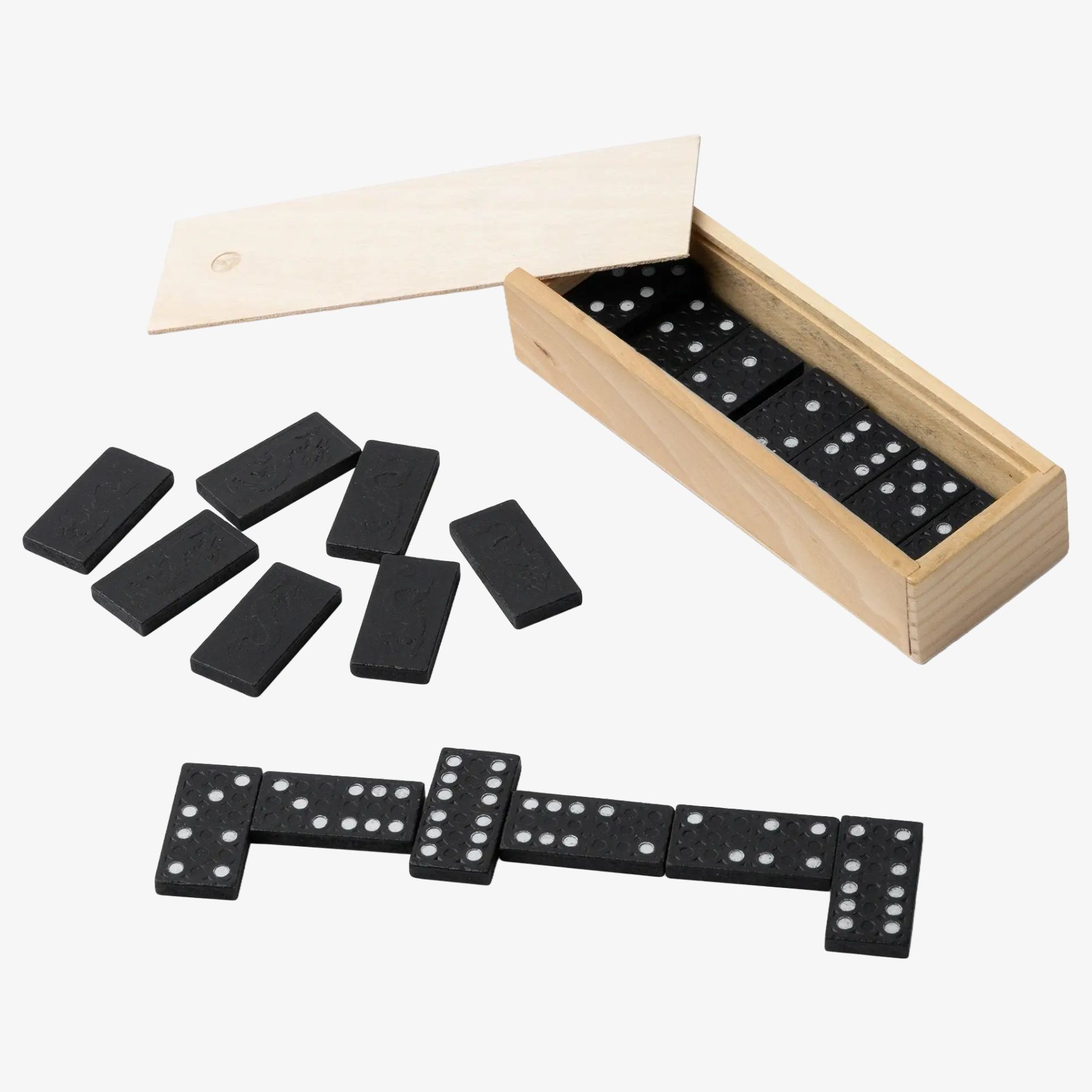 Le jeu de dominos Domis en bois comprend 28 pièces rangées dans un coffret à couvercle coulissant. Format compact adapté au rangement et au transport. Dimensions : 14,6 x 3 x 3 cm.