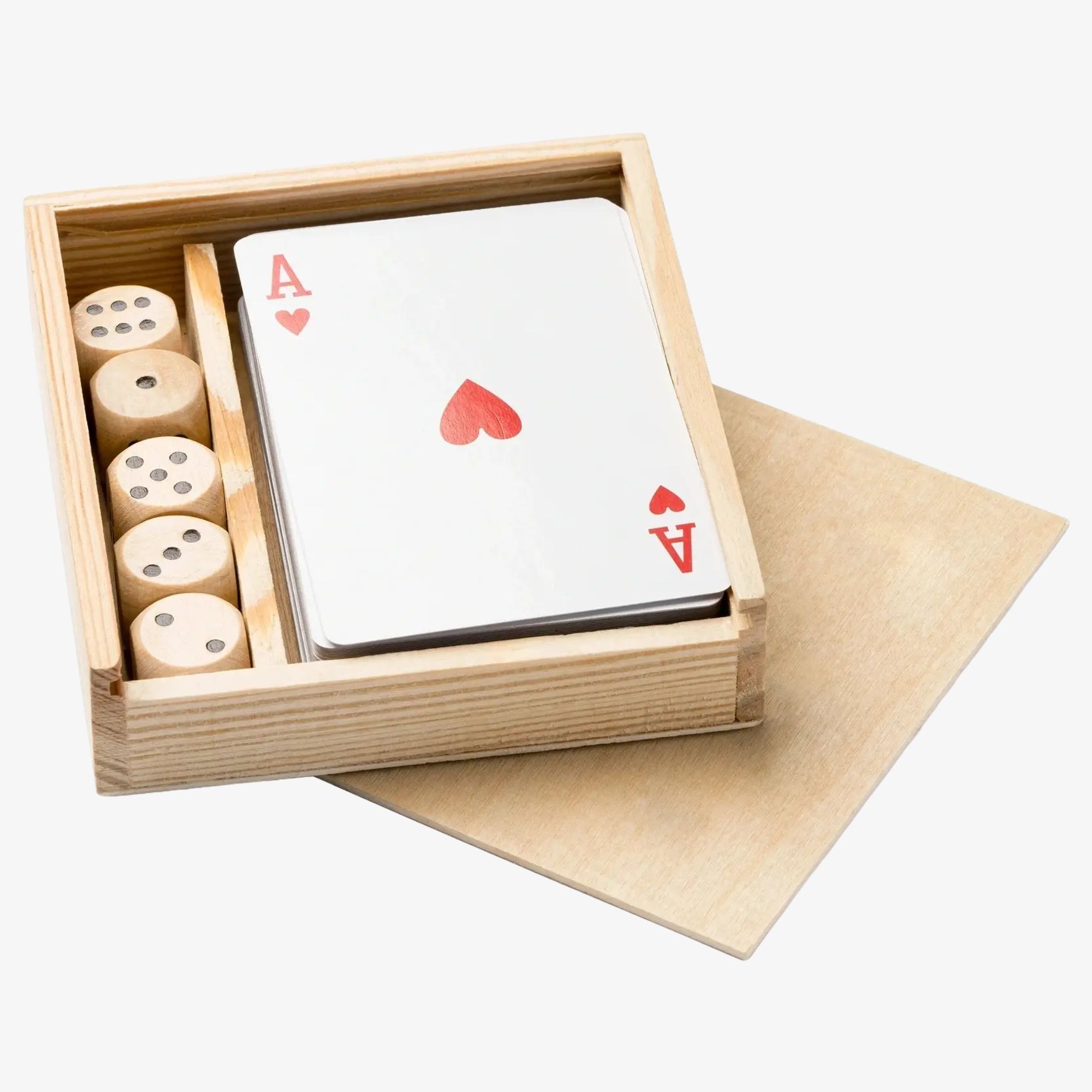 Le Brisca ensemble jeux société ju1016 réunit un jeu de dés et un jeu de cartes françaises dans une boîte en bois avec deux compartiments et un couvercle coulissant. Format compact pour le rangement et le transport.