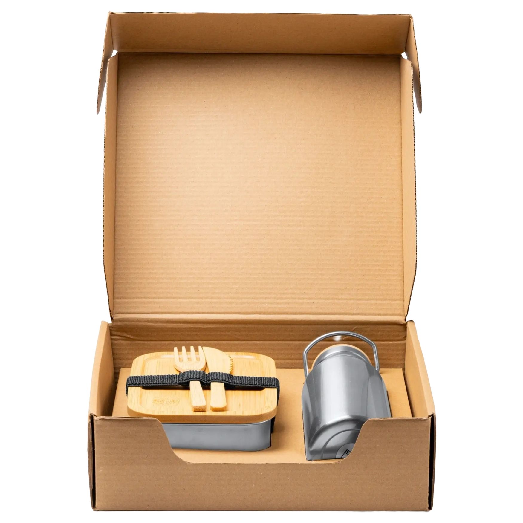 L'ensemble gamelle acier inoxydable 304 comprend une gamelle de 800 ml avec couvercle bambou et bande élastique pour sécurité ainsi qu'une bouteille acier inoxydable 304 de 500 ml et un ensemble couverts bambou.