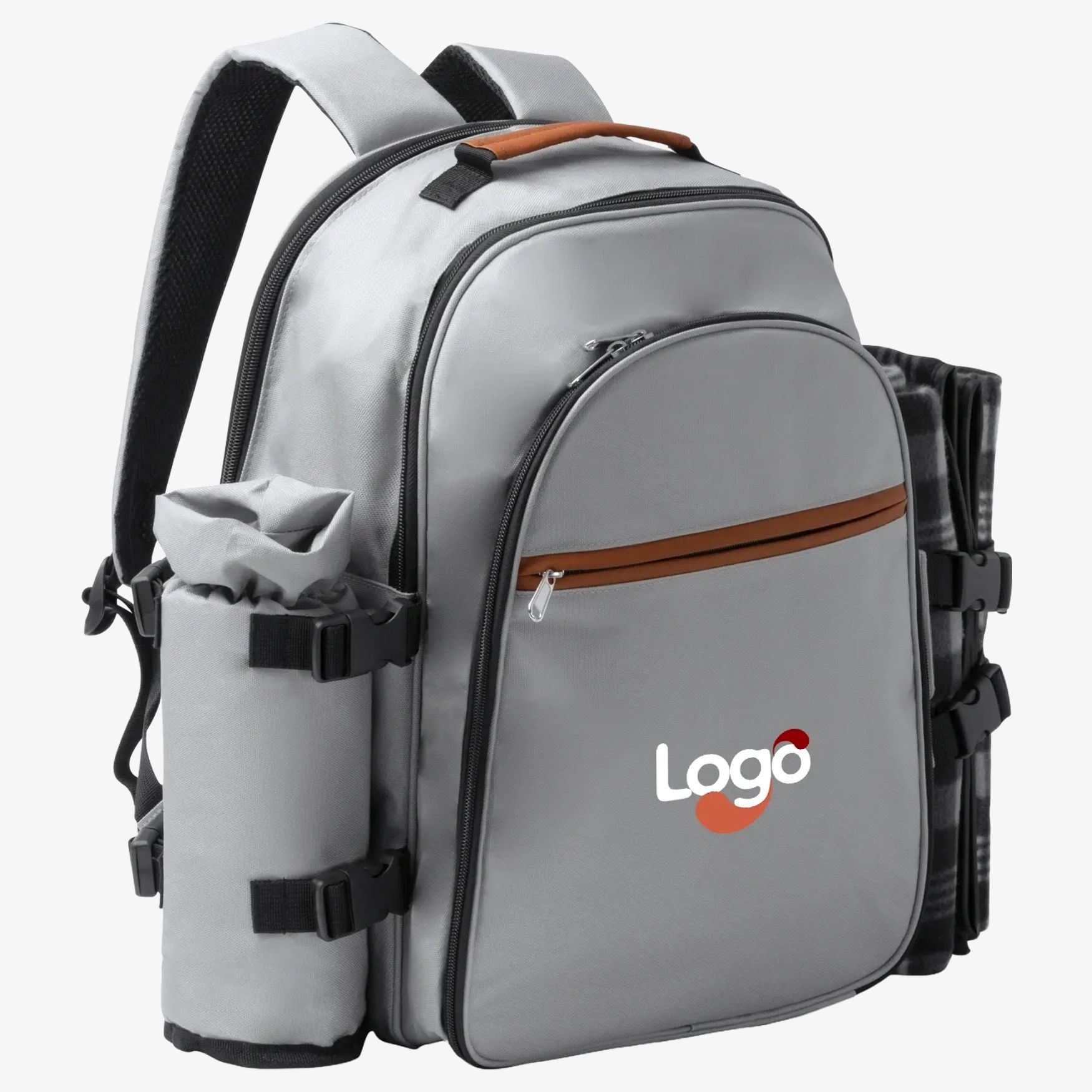 Le sac à dos GARTEN est conçu en polyester RPET et destiné au transport d'accessoires pour pique-nique. Il comprend un compartiment principal avec deux tasses, deux assiettes et deux couverts, un compartiment latéral pour la couverture incluse, ainsi qu'un compartiment pour bouteilles. La conception facilite l'organisation et le transport.