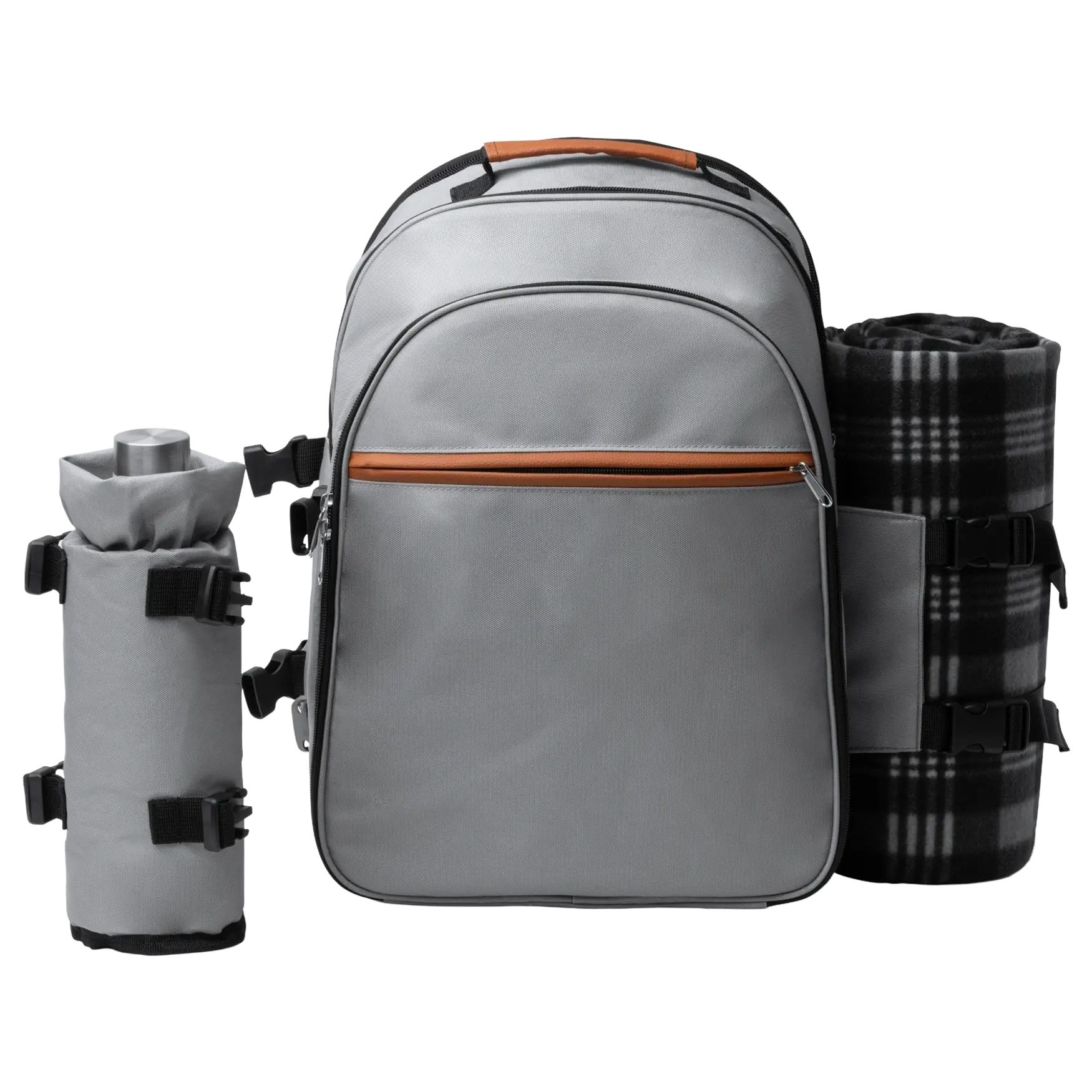Le sac à dos GARTEN est conçu en polyester RPET et destiné au transport d'accessoires pour pique-nique. Il comprend un compartiment principal avec deux tasses, deux assiettes et deux couverts, un compartiment latéral pour la couverture incluse, ainsi qu'un compartiment pour bouteilles. La conception facilite l'organisation et le transport.