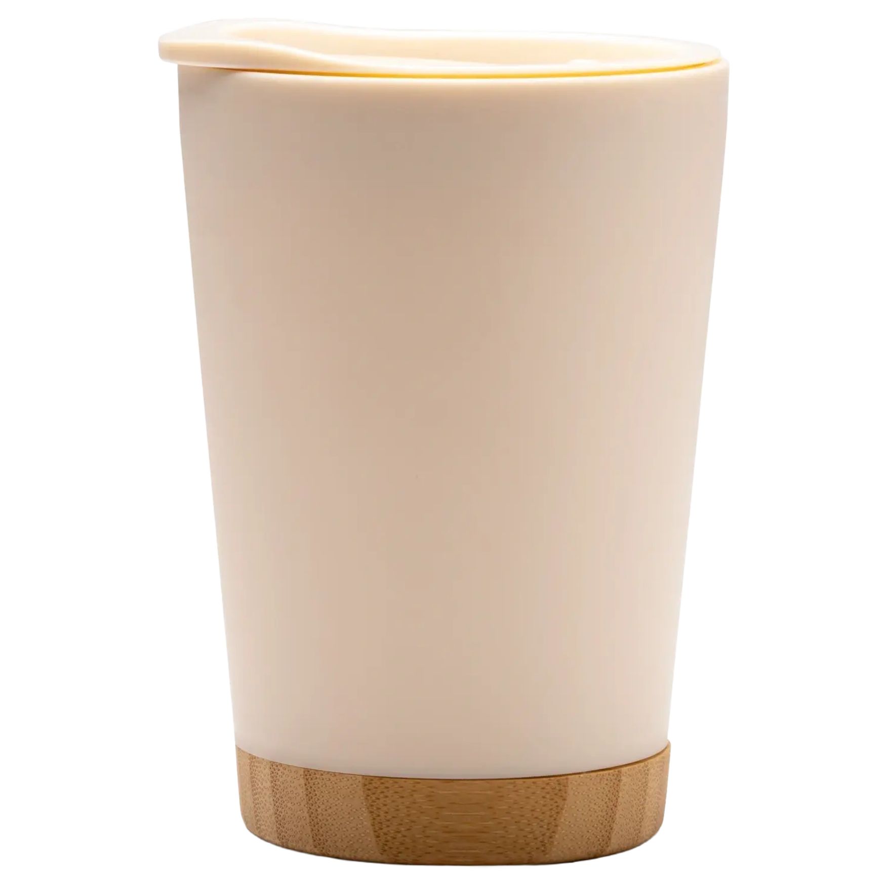 Le gobelet double paroi MIRIN associe un corps en polypropylène recyclé et une base en bambou. Il est équipé d'un couvercle doseur et offre une capacité de 290 ml.