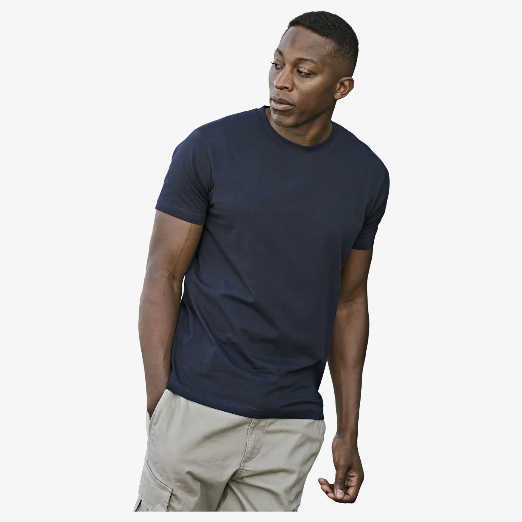 Le Unlabeled tee est un tee-shirt à col rond avec coupe régulière, manches droites et bande de propreté d'épaule à épaule. Le col double épaisseur avec élasthanne contribue à une tenue stable au porter.