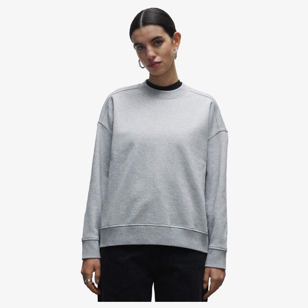 Ce sweat-shirt pour femme présente une coupe ample et confortable. Les côtes épaisses aux poignets et au col offrent une finition soignée. Les coutures des épaules sont rabattues pour un ajustement amélioré, et une bande de propreté est intégrée à l'intérieur du col pour plus de confort. Un détail de « demi-lune » à double coque se trouve également à l'intérieur du col. Ce vêtement est conçu pour offrir un confort quotidien avec une attention particulière aux détails et à la qualité de fabrication.