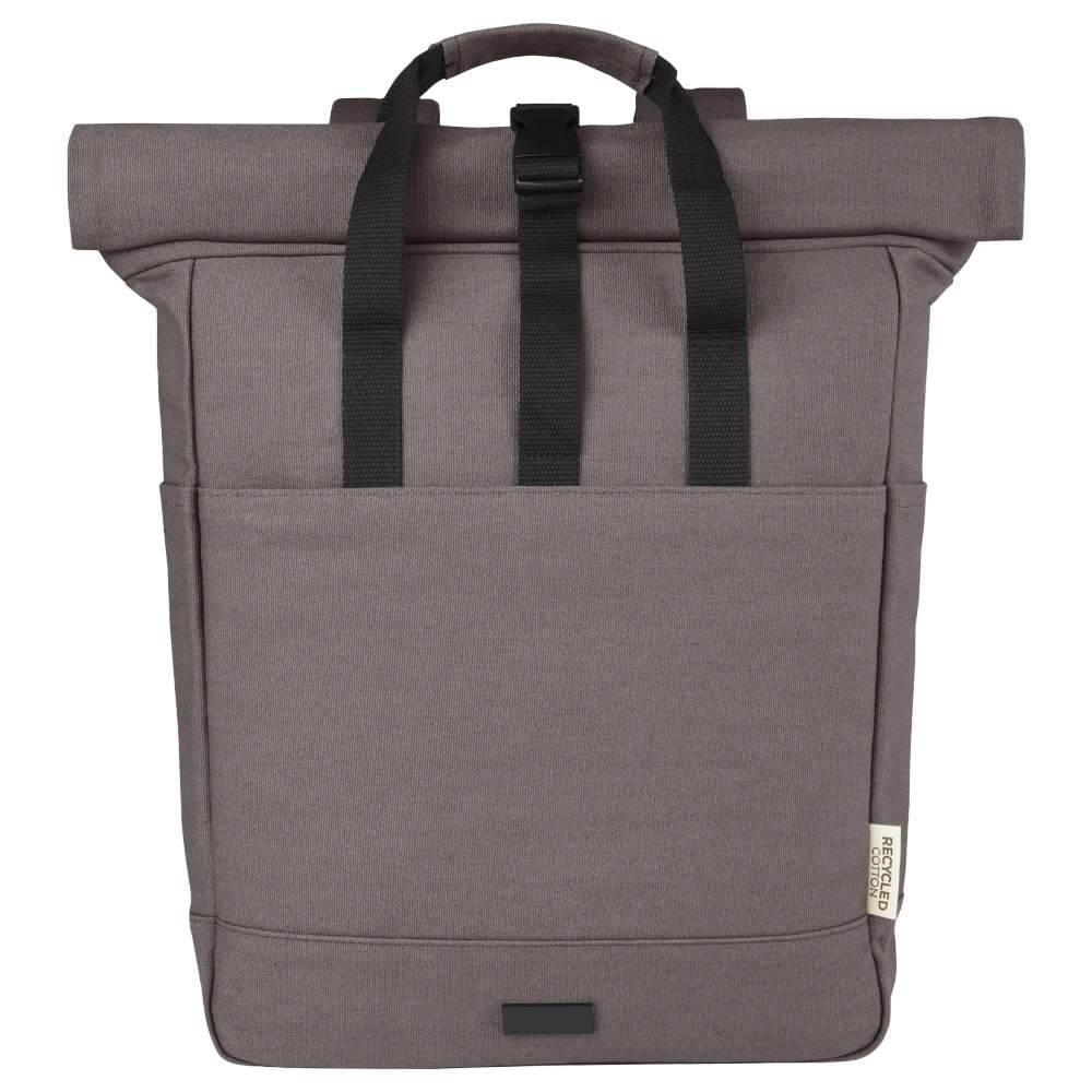 Sac à dos pour ordinateur portable joey de 15L en toile recyclée avec dessus enroulable. Ce sac à dos est composé de matériaux résistants et durables, incluant une toile recyclée et une doublure RPET. Il dispose d'une poche pour tablette dédiée et d'un compartiment rembourré pour ordinateur portable de 15 pouces. Le sac à dos est également équipé de deux poches latérales pour bouteilles d'eau et d'une grande poche frontale zippée, ainsi qu'une ouverture zippée sur le dessus pour faciliter le rangement et la sécurité. Les deux poignées de sangle renforcées offrent un transport facile et confortable. Dimensions : 32 x 12 x 56 cm. Composition : 80% coton recyclé ; 20% coton.