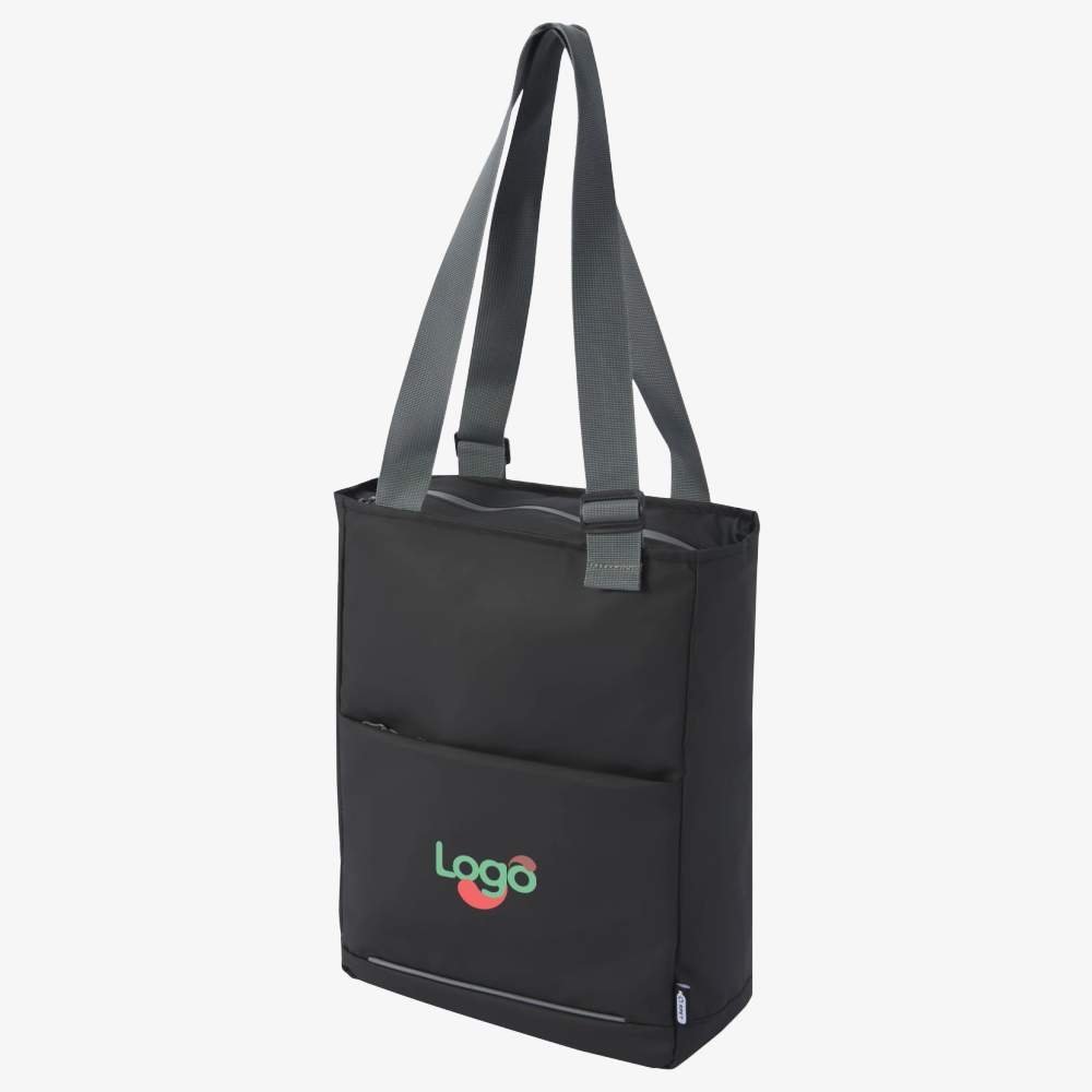 Sac shopping résistant à l'eau pour ordinateur portable, fabriqué à partir de matériaux recyclés, y compris les fermetures zippées. Il dispose d'une pochette pour tablette dédiée, d'un compartiment pour ordinateur portable de 14 pouces, de plusieurs poches pour l'organisation, d'une poche avant avec panneau d'organisation, de poignées réglables de 35 cm de long et d'une sangle pour les bagages. Les matériaux recyclés comprennent le tissu principal, la doublure, la sangle et les fermetures zippées. Capacité : 14 litres. Dimensions : 29,5 x 12 x 40 cm. Sans PVC. Composition : polyester recyclé. Ce sac est personnalisable, offrant la possibilité d'ajouter votre logo ou un visuel de votre choix.