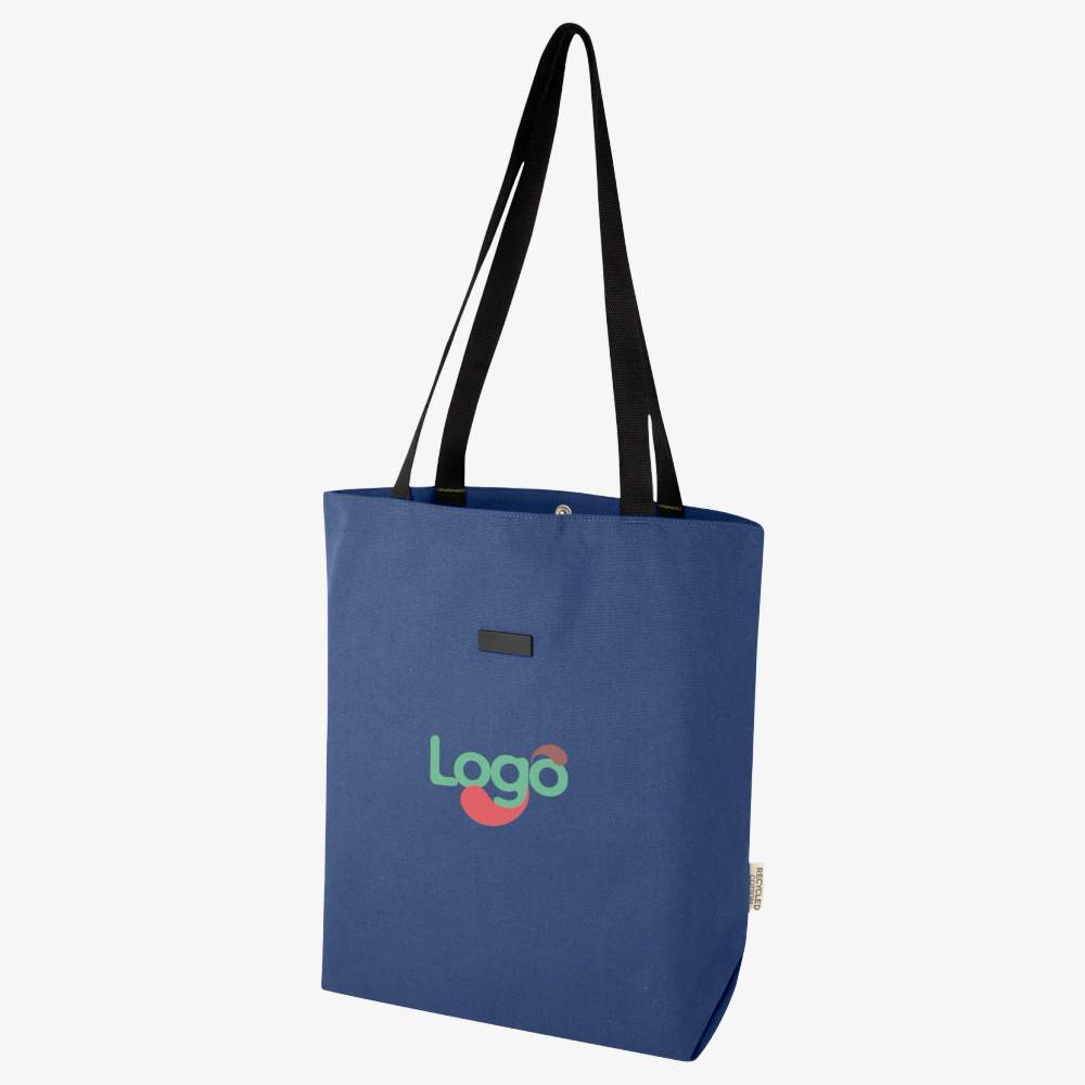 Sac shopping en toile recyclée et doublure en RPET. Ce sac shopping polyvalent dispose d'un compartiment rembourré pour ordinateur portable de 15" et de deux poches à l'intérieur pour un téléphone, un portefeuille ou des accessoires. Il dispose d'une fermeture à bouton facile pour l'ouverture et de poignées confortables en toile de coton. Plaque métallique décorative à finition subtile et mate. Dimensions : 39 x 11 x 39,5 cm. Composition : 80% coton recyclé, 20% coton. Ce sac peut être personnalisé avec votre logo ou votre visuel pour une communication efficace et originale.