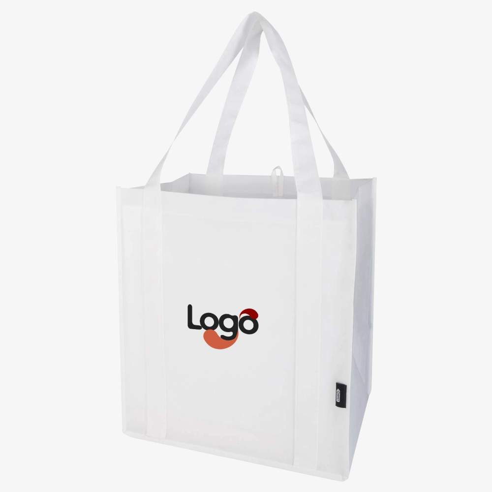 Sac shopping Liberty non tissé recyclé avec fond rigide de 29 litres, fabriqué en RPET durable et résistant à la déchirure. Doté d'un grand compartiment principal et de poignées de 25cm de long. Capacité de 29 litres et capacité de charge maximale de 12 kg. Dimensions : 33 x 25,4 x 36 cm. Composition : polyester recyclé. Ce sac est personnalisable, permettant l'ajout de votre logo ou visuel pour une communication efficace lors de vos événements.
