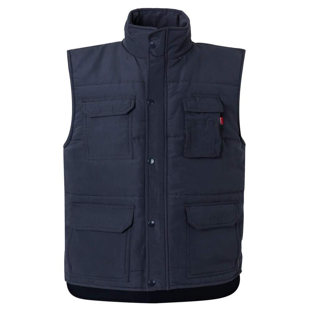 Bodywarmer multipoches. Rabat central avec boutons-pression. Taille élastiquée. Empiècement coupe-vent aux emmanchures. 7 poches : 2 poches poitrine avec rabat et bande auto-agrippante dont 1 avec compartiment pour stylos, 2 poches frontales avec rabat et bande auto-agrippante et en dessous de chacune 2 poches latérales, 1 poche intérieure.
