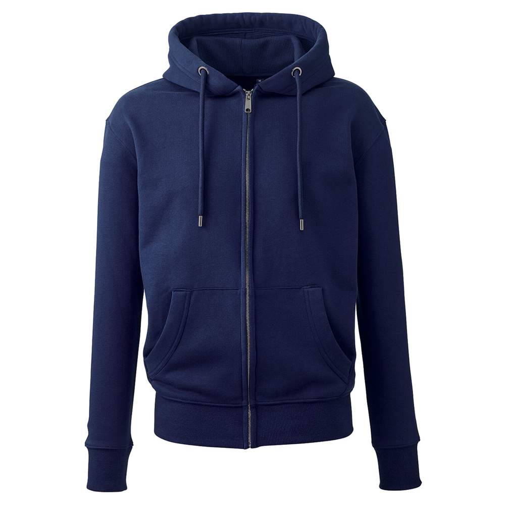 Felpa con cerniera per uomo in tessuto pelle di pesca al tatto morbido. Cappuccio in maglia a coste. Chiusura a zip e cordoni senza nickel. Interno in pile grattugiato. Finiture ad ago doppio di alta qualità. Polsini costolati tagliati e cuciti due in uno. Tasche kanguro. Etichetta della taglia dello stesso colore.