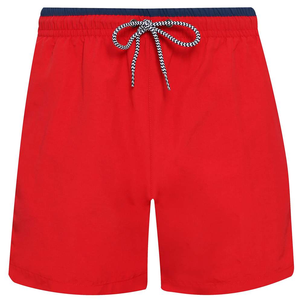 Costume da bagno per uomo. Cintura di colore contrastante su certi colori, regolazione della vita, cordone di regolazione a righe, cintura elastica e fodera interna in rete. Due tasche laterali con fodera interna in rete e una tasca posteriore con chiusura a velcro. Questo prodotto non ha etichetta di marca sul collo.
