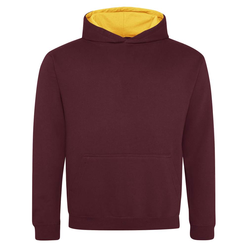 Felpa con cappuccio contrastato per bambini. Senza cordoncino secondo la nuova legislazione europea. Tasca a marsupio. La tasca comprende aperture per un cavo per cuffie. Composizione: 80% cotone, 20% poliestere.