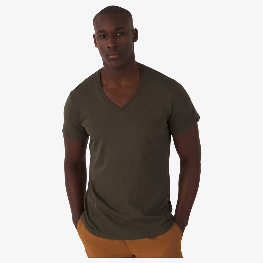 T-shirt col V. Taglia slim medio. Maniche corte. Cuciture laterali. Collo a coste fini. Rinforzo dalla spalla alla spalla. Superficie liscia per una stampa netta e precisa. 100 % cotone pettinato - biologico certificato o in conversione biologica.