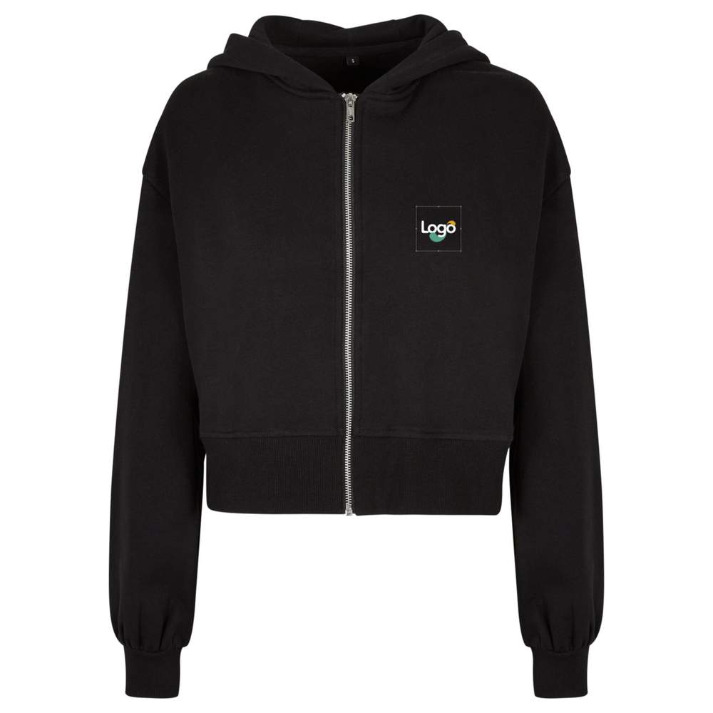 Questo giubbotto per donna è un capo di tendenza con la sua corta misura oversize. Si chiude con una cerniera davanti. Le spalle cadenti, il cappuccio XL e le larghe bande a coste sulle maniche e in vita aggiungono stile. Il giubbotto con cappuccio con zip per donna è composto da una miscela cotone-poliestere confortevole. Questo giubbotto offre la possibilità di personalizzazione, in particolare tramite ricamo, per un risultato unico e adatto alla vostra immagine di marca.