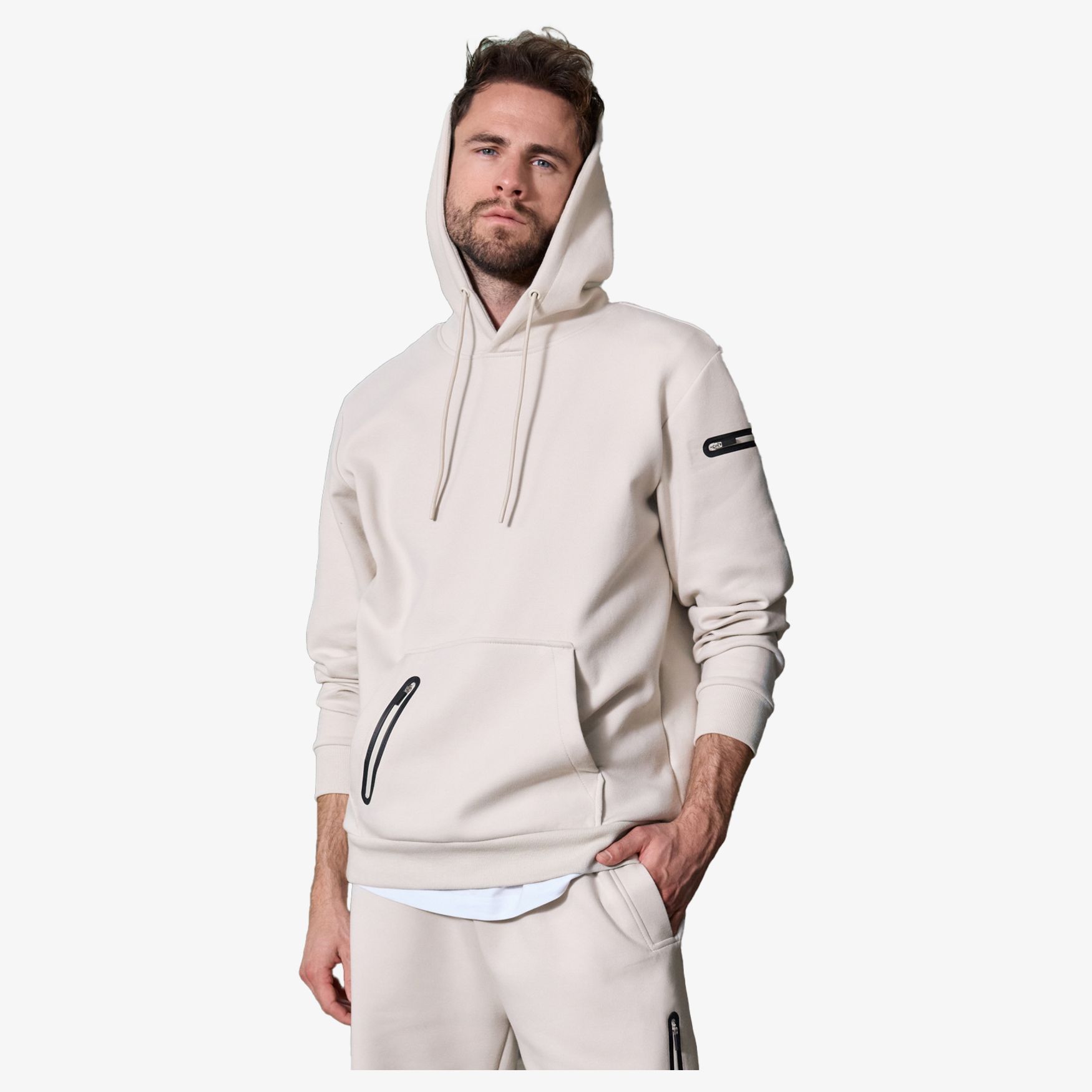 Questa felpa con cappuccio per uomo è realizzata in tessuto interlock, offrendo un maggiore comfort e durabilità. La sua composizione combina cotone, poliestere riciclato ed elastam per un tocco gradevole e una buona tenuta. È dotata di una pratica tasca marsupio, nonché di una tasca zip aggiuntiva per riporre i piccoli oggetti in sicurezza. Una tasca zip è presente anche sul braccio sinistro, bordata da una striscia decorativa. Questa felpa è progettata per un uso quotidiano e si adatta a varie attività.