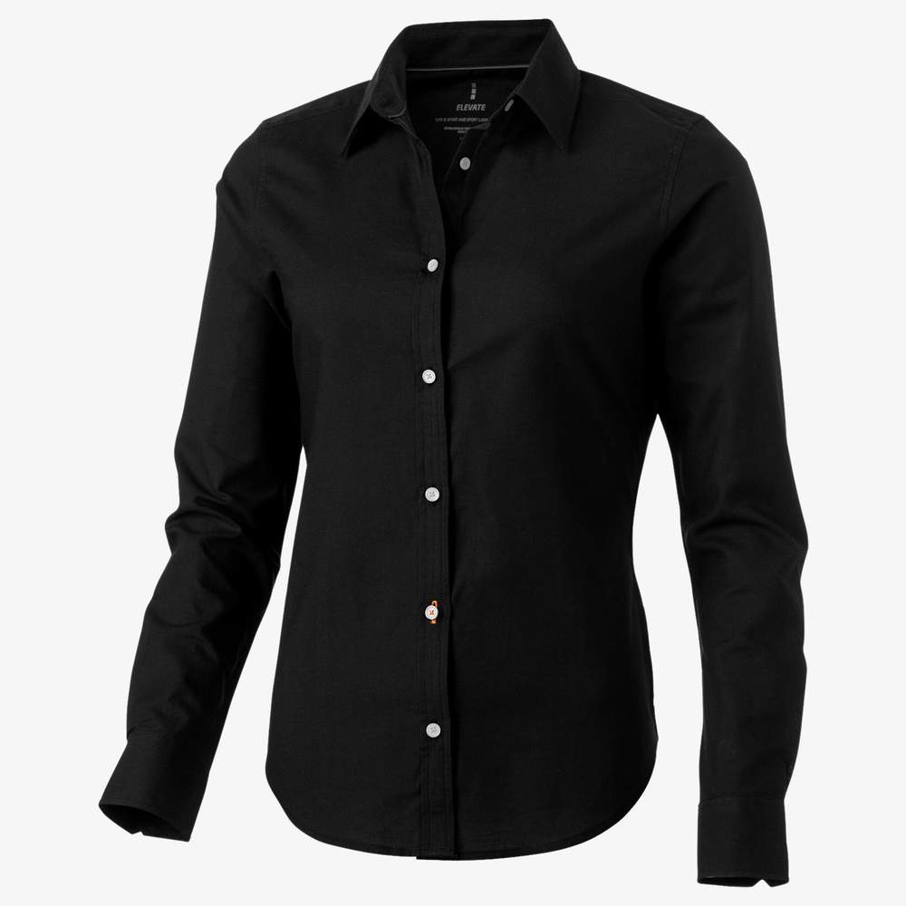 Camicia a maniche lunghe per donna, realizzata in coton. Presenta polsini regolabili con piega semplice per una silhouette lusinghiera. I bottoni perla incisi aggiungono un tocco di eleganza. Le cuciture formate e la vita elastica garantiscono un'adattamento confortevole. Un piping satinato all'interno del colletto completa il design. L'etichetta principale è realizzata in trasferimento per un maggiore comfort.