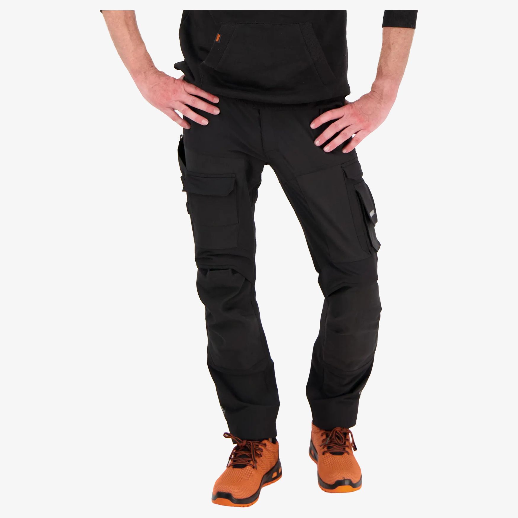 I Alon Trousers pantaloni da lavoro stile jogger stretch a 4 vie con superficie idrorepellente, vita elasticizzata con cordoncino, tasche laterali, tasche sulla coscia, tasca porta metro, tasche posteriori e rinforzi alle ginocchia.