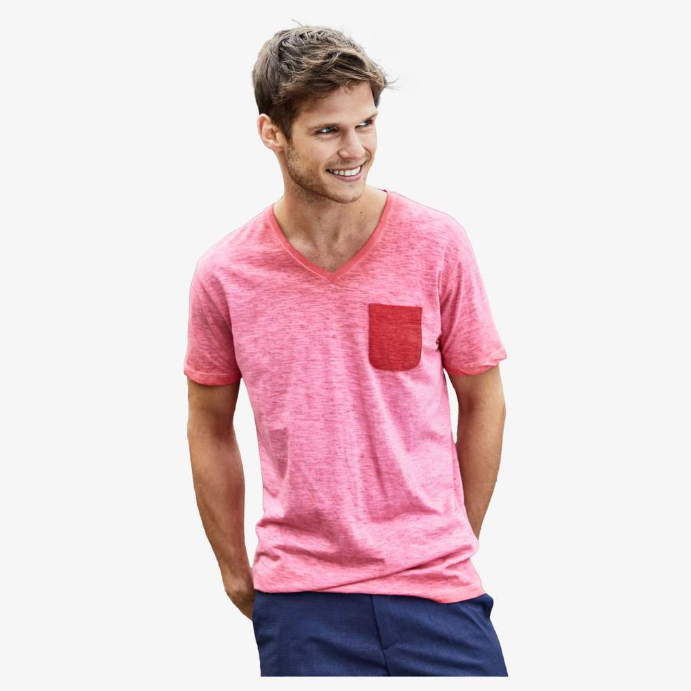 Maglietta a maniche corte per uomo dal look vintage. Jersey semplice in cotone biologico pettinato e filato ad anello. Tecniche di stampa avanzate. Ha uno scollo a V, polsini in elastam, tasca sul petto di colore contrastante 9 x 10,5 cm. Questa maglietta offre una superficie ideale per la personalizzazione con ricamo, permettendo di aggiungere il tuo logo o qualsiasi visivo di tua scelta. È possibile personalizzare questa maglietta per soddisfare le tue esigenze e i colori del tuo marchio.