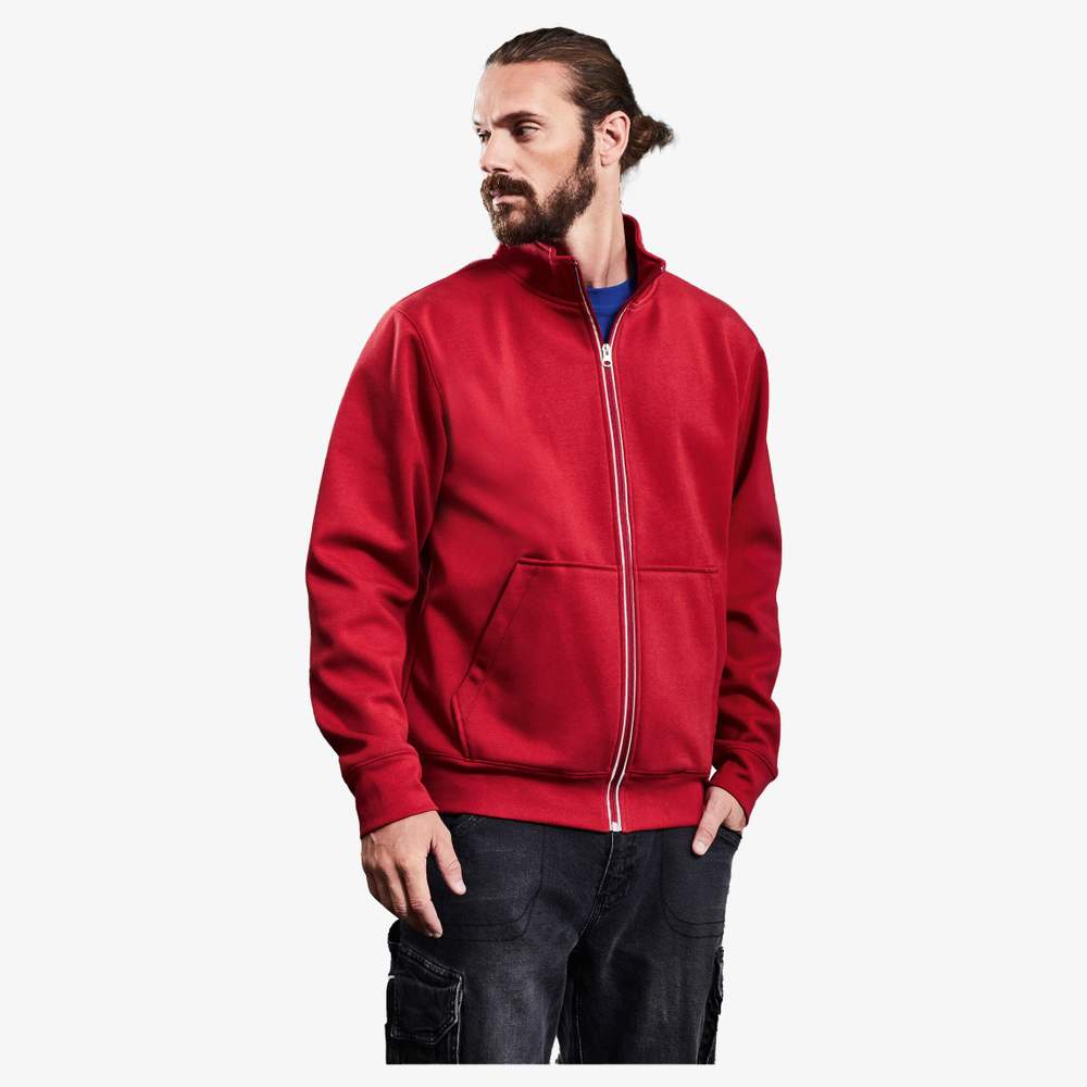 Veste funzionale con collo alto e tasca marsupio, in materiale a doppio strato confortevole, esterno in jersey di cotone semplice, interno in pile. Chiusura zip riflettente sul davanti. Tasca marsupio con chiusura invisibile. Orlo con elastam. Composizione : 55% poliestere, 45% cotone. Possibilità di personalizzazione con ricamo per un marchio unico.