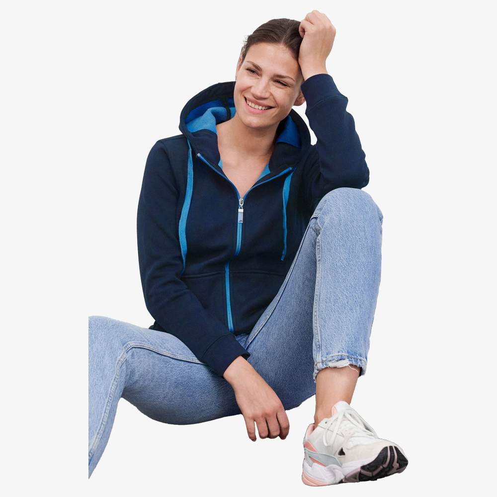 Questa giacca double face per donna unisce comfort e stile. Realizzata con tessuto esterno in cotone e interno in polare, offre una sensazione di morbidezza e calore. Il suo taglio femminile e la chiusura integrale garantiscono un adattamento ottimale. È dotata di un cordoncino di regolazione, di un cappuccio, di un colletto interno e di una tasca a marsupio. I polsini e il fondo del corpo sono bordati di costine con elastan per una tenuta comoda. Questa giacca è personalizzabile con ricamo, ideale per esporre il vostro logo o il vostro disegno.