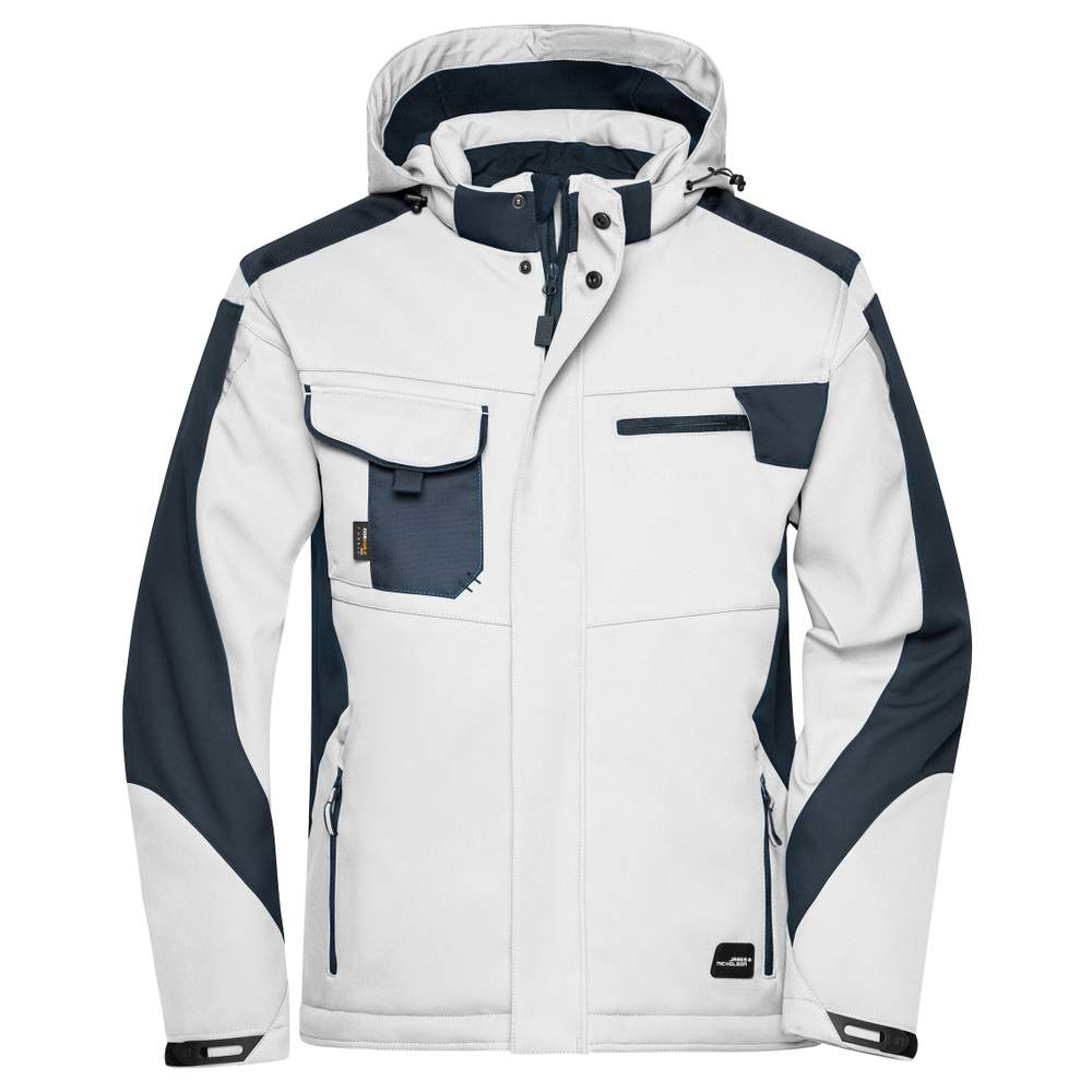 Giacca softshell professionale per uomo, progettata per offrire comfort e protezione. Realizzata con un materiale softshell robusto, è resistente al vento e impermeabile, con una impermeabilità di 2.000 mm. La progettazione garantisce una traspirabilità con una permeabilità al vapore di 2.000. Comprende un colletto alto foderato con pile morbido, un cappuccio regolabile e rimovibile, e rinforzi in CORDURA® sulle spalle. La cerniera lampo completa è dotata di protezione contro il vento. I polsini interni offrono un'isolamento aggiuntivo. La giacca dispone di numerose tasche, tra cui tasche laterali, una tasca petto con cerniera lampo, una tasca petto a soffietto e una tasca interna per telefono cellulare. Elementi riflettenti sono presenti sul braccio e sulla schiena per una migliore visibilità. Una cerniera permette la personalizzazione sulla schiena.