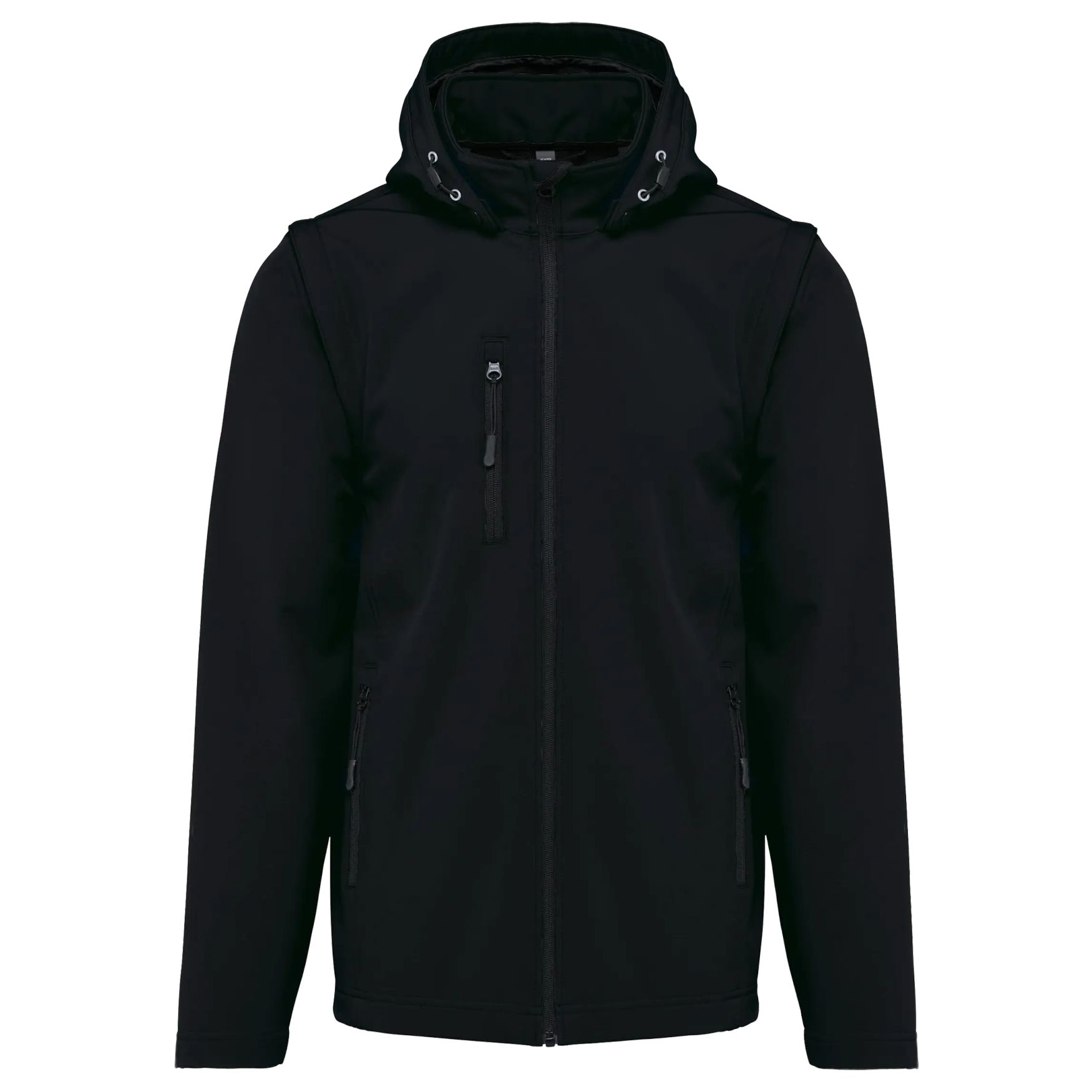 Giacca softshell unisex con cappuccio e maniche rimovibili. Presenta una taglia stretta e una chiusura zip. Dotata di due tasche zip anteriori e una tasca zip sul lato destro. Il cappuccio è rimovibile grazie a bottoni pressione e un cordoncino di regolazione è incluso. Le maniche sono rimovibili tramite zip. Una finitura doppia cucitura è presente alla base delle maniche e del capo. Tessuto laminato 3 strati traspirante che offre 3000 /24 h e un'impermeabilità di 8000 mm.