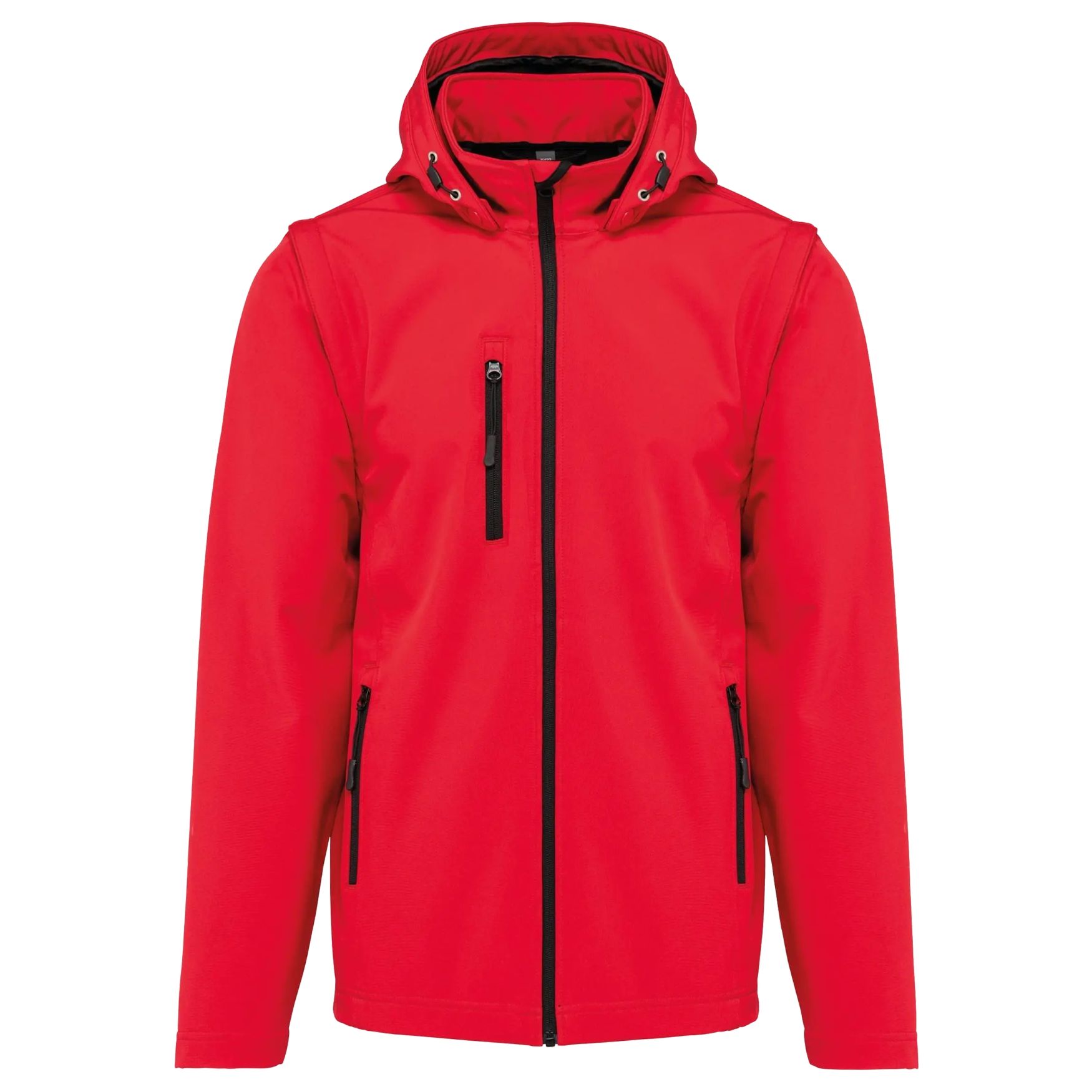 Giacca softshell unisex con cappuccio e maniche rimovibili. Presenta una taglia stretta e una chiusura zip. Dotata di due tasche zip anteriori e una tasca zip sul lato destro. Il cappuccio è rimovibile grazie a bottoni pressione e un cordoncino di regolazione è incluso. Le maniche sono rimovibili tramite zip. Una finitura doppia cucitura è presente alla base delle maniche e del capo. Tessuto laminato 3 strati traspirante che offre 3000 /24 h e un'impermeabilità di 8000 mm.