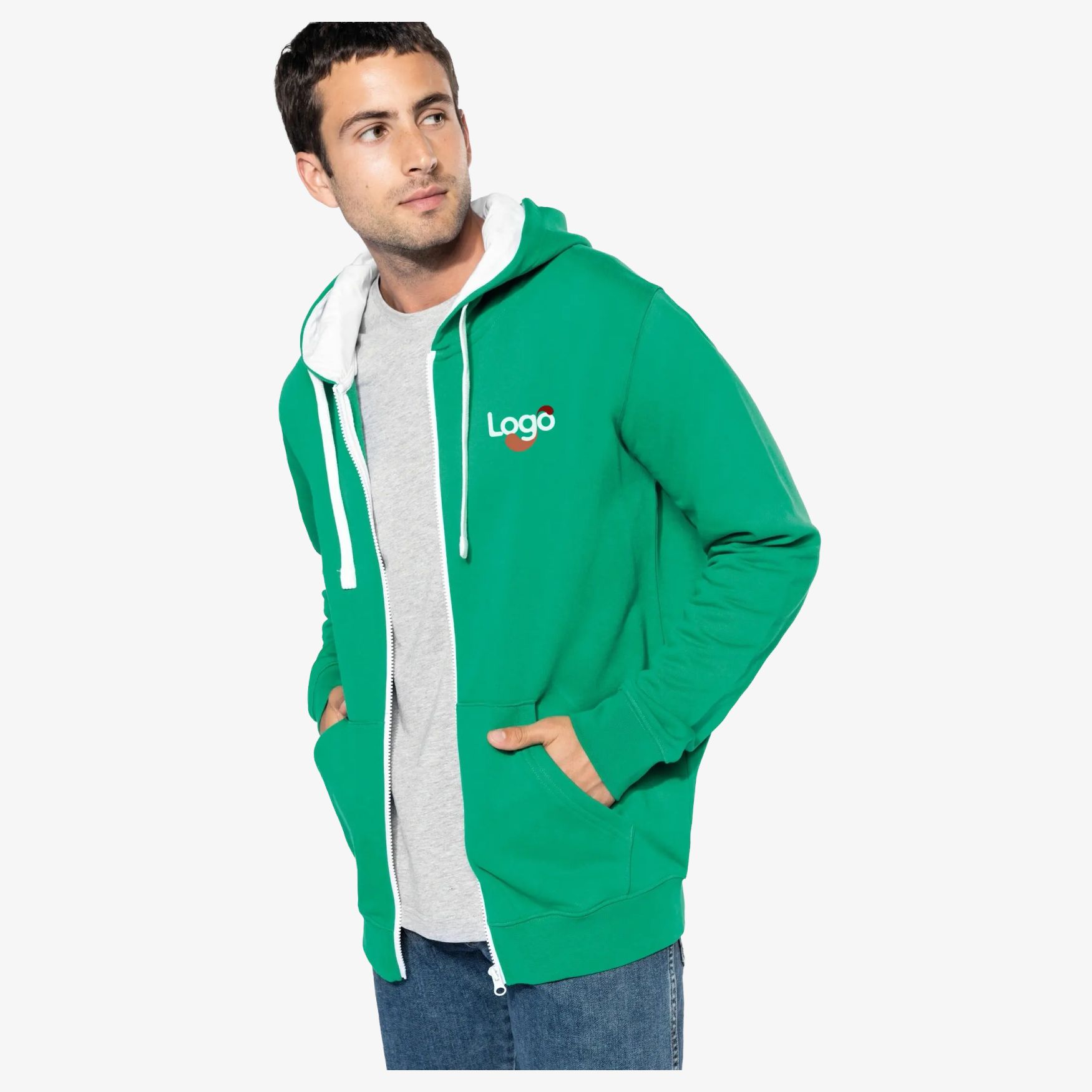 Felpa con zip cappuccio contrastato, 80% cotone pettinato / 20% poliestere. Molleton grattugiato. Passante filo auricolari nella tasca marsupio e collo. Bordi in costoni bassi delle maniche e del capo. Cappuccio foderato e contrastato con cordoncino di regolazione. Zip YKK® contrastata. Possibilità di personalizzazione in ricamo per una marcatura unica.