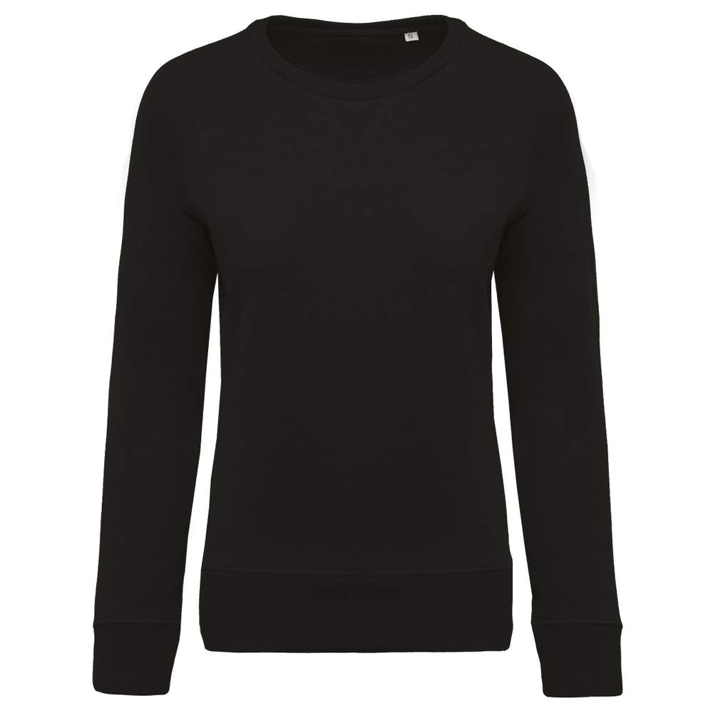 Maglia donna in molleton di cotone biologico e poliestere certificato OCS Blended. Taglio moda con collo rotondo e maniche raglan. Bordatura ai polsi, all'orlo e al collo. Banda interna di pulizia e applicazione a V sul colletto.