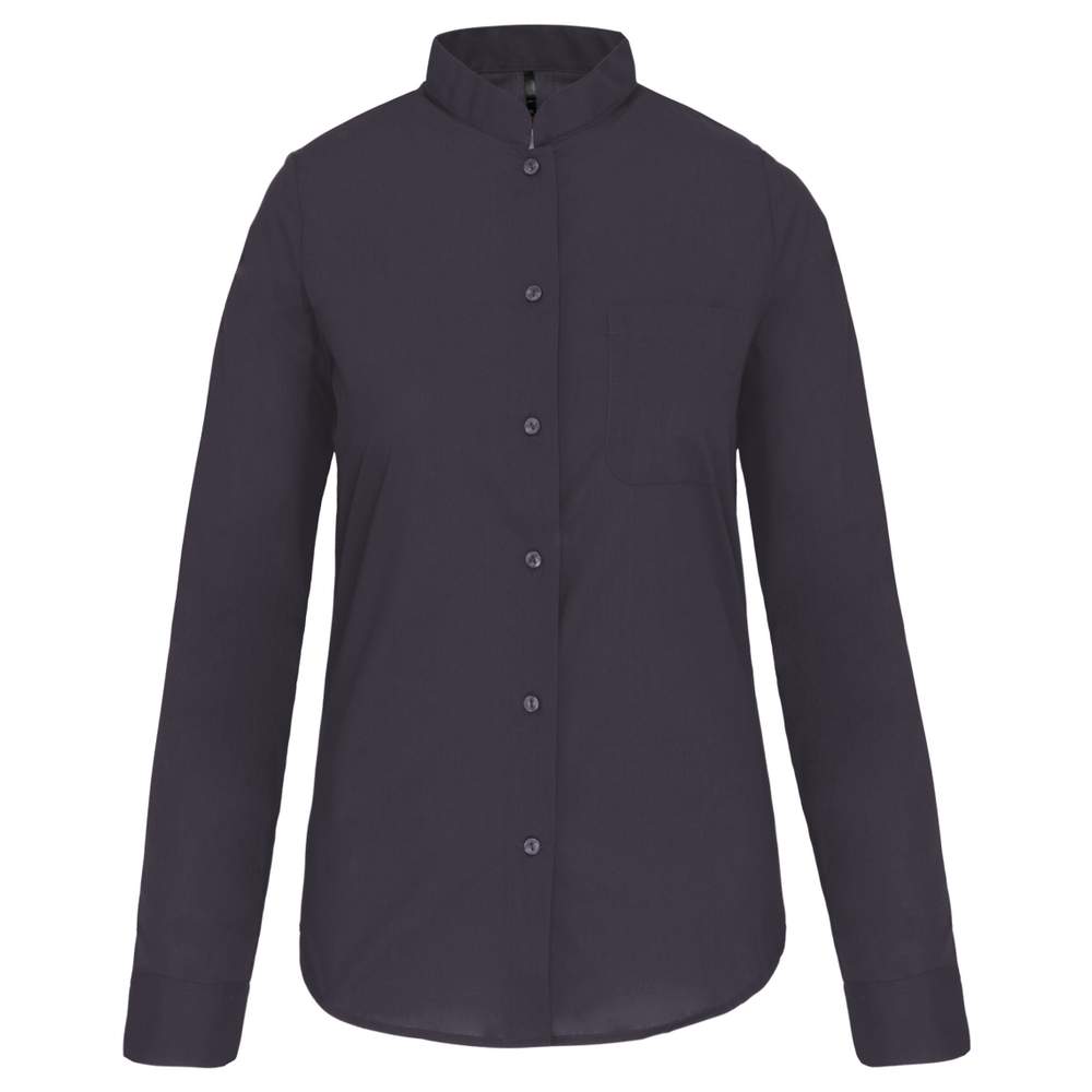 Questa camicia col mao maniche lunghe per donna è realizzata in 65% poliestere e 35% cotone popeline, offrendo il massimo comfort e una facile manutenzione. Presenta un col mao non abbottonato, bottoni tono su tono e una tasca petto lato sinistro a V. Il polso è regolabile grazie ad una patta di manica indeformabile con bottone di richiamo e il fondo è arrotondato.