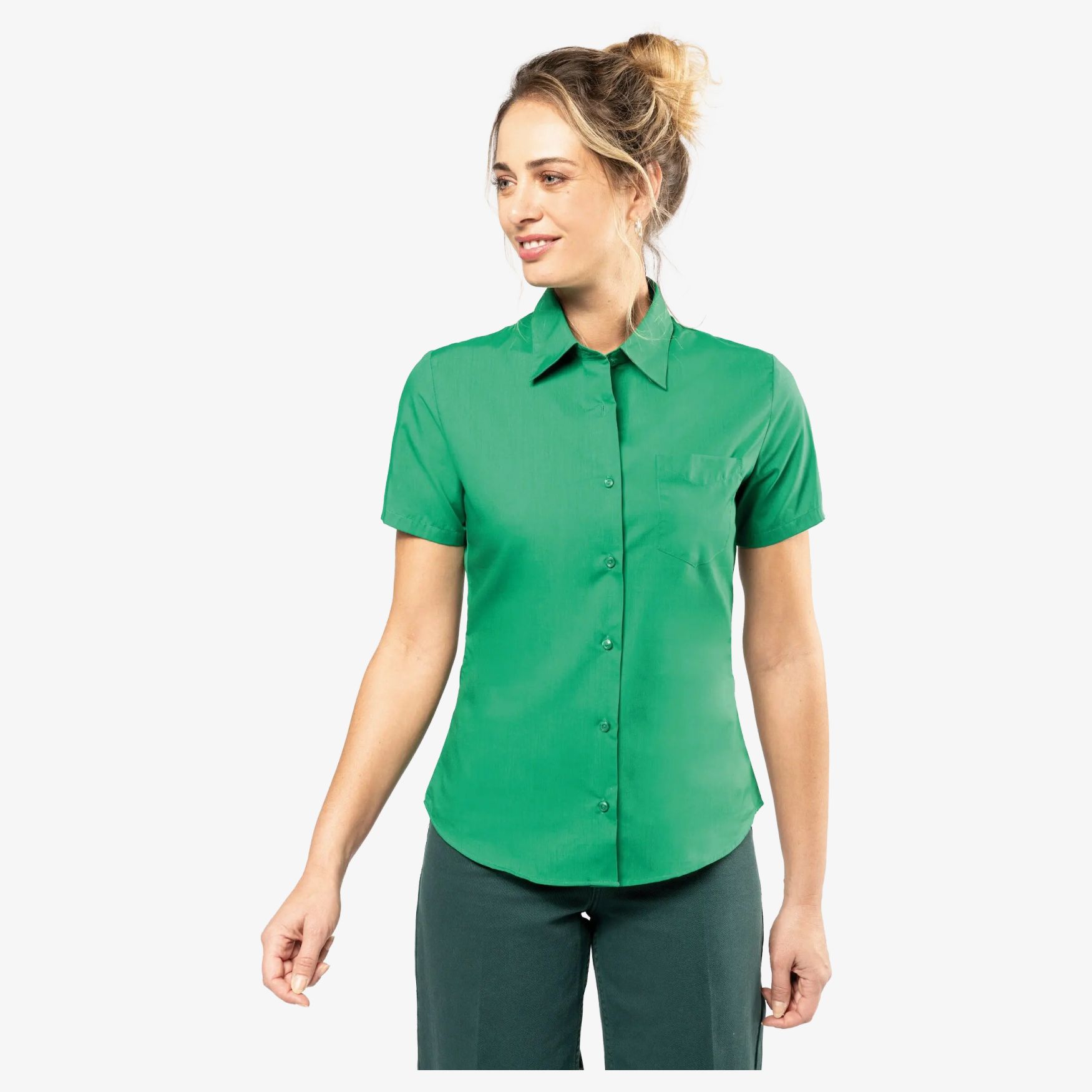Questa camicia per donna è realizzata con una miscela di poliestere e cotone, offrendo comfort ottimale e buona tenuta. Presenta un taglio classico con maniche corte, ideale per le giornate calde o abiti casual. La sua progettazione accurata garantisce una durabilità accresciuta. È dotata di colletto non abbottonato e bottoni a tinta unita per un aspetto discreto ed elegante. Una tasca applicata sul petto aggiunge un tocco pratico.
