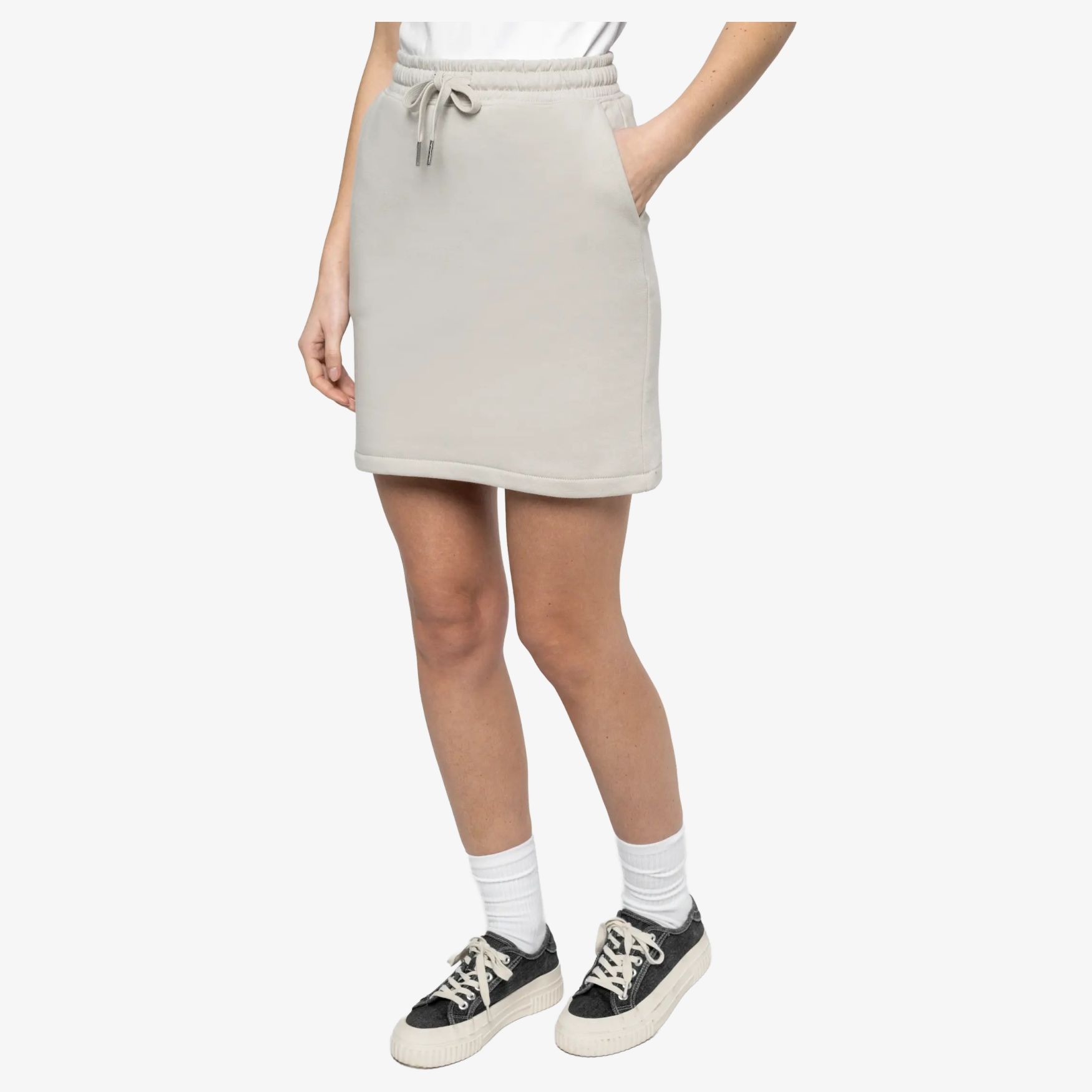 Gonna di felpa ecoresponsabile per donna. Questo modello combina comfort e coscienza ambientale grazie alla sua composizione in cotone peigné e poliestere riciclato. Progettata per un uso quotidiano, questa gonna offre un'alternativa comoda e di stile. Presenta una vita elasticizzata con cordone di regolazione piatto in cotone biologico e puntale del cordone in metallo riciclato, garantendo un'adattamento ottimale. Le due tasche italiane sui lati offrono uno spazio pratico per piccoli oggetti. La finitura dell'orlo del vestito è realizzata con un semplice orlo cucito. L'assenza di etichetta del marchio sul colletto facilita la personalizzazione.