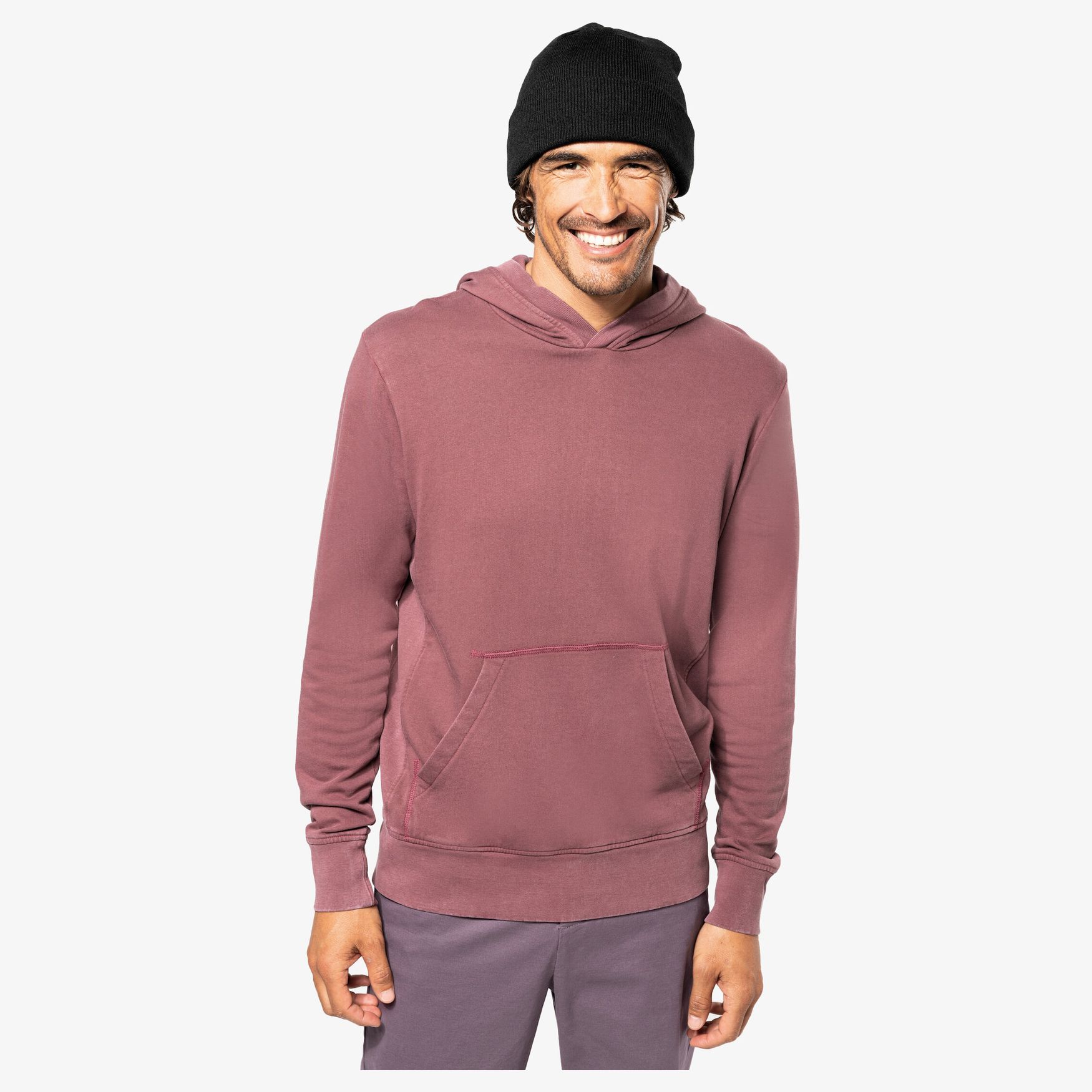 Felpa con cappuccio da uomo in cotone con felpa non garzata e cappuccio doppiato incrociato. Tasca a marsupio e finiture a costine. Trattamento che conferisce un aspetto slavato e invecchiato, con possibili variazioni di colore tra i capi. Etichetta taglia senza etichetta al collo, adatta alla personalizzazione.