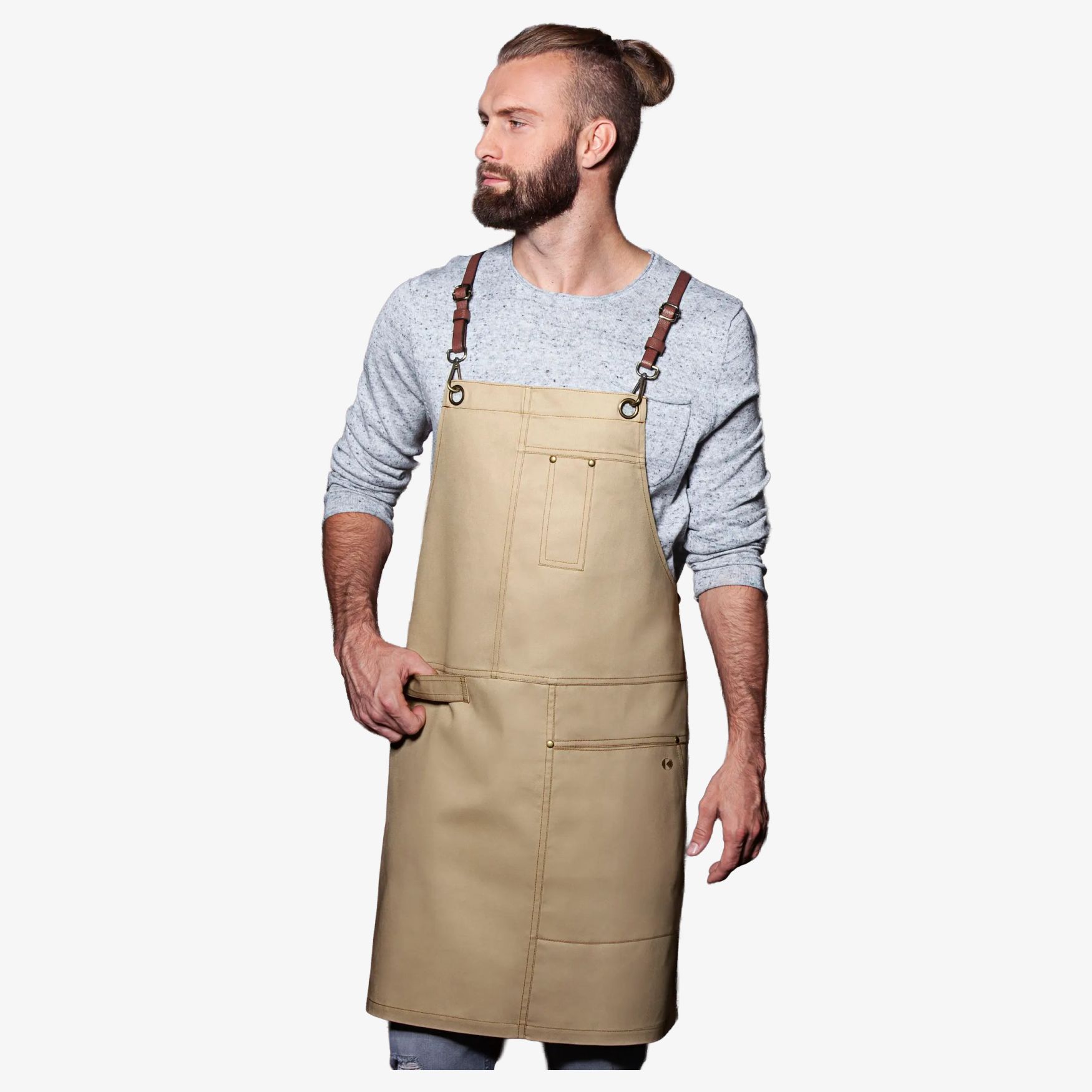 Il bib apron urban x-style è un grembiule con bavero realizzato in 100% cotone. Misura 68 x 80 cm e comprende spallacci incrociati con moschettoni e fibbie per regolare la lunghezza. Una cinghia aggiuntiva in vita consente di regolare la larghezza. La tasca laterale sinistra di 16 x 24 cm offre un vano per penne. I rivetti sono di colore bronzo con cuciture a contrasto. Gli spallacci sono in vera pelle e una fibbia in tessuto è posizionata sul lato destro.