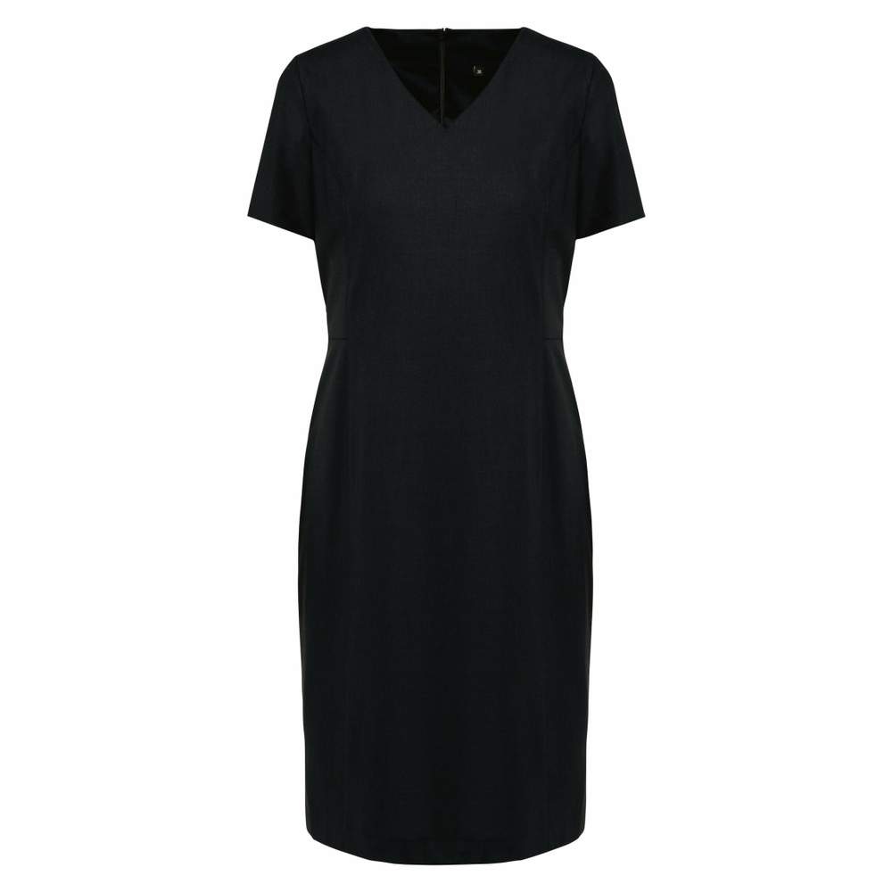 Abito dritto elegante. Taglia adattata con pannello a cucitura a costola per rafforzare le cuciture. Scollatura a V con finitura interna imbottita. Chiusura lampo invisibile dietro. Presenza di 2 pinces vita dietro e di una fenditura di comfort nella parte inferiore della schiena. Rivestimento volante con fenditura.