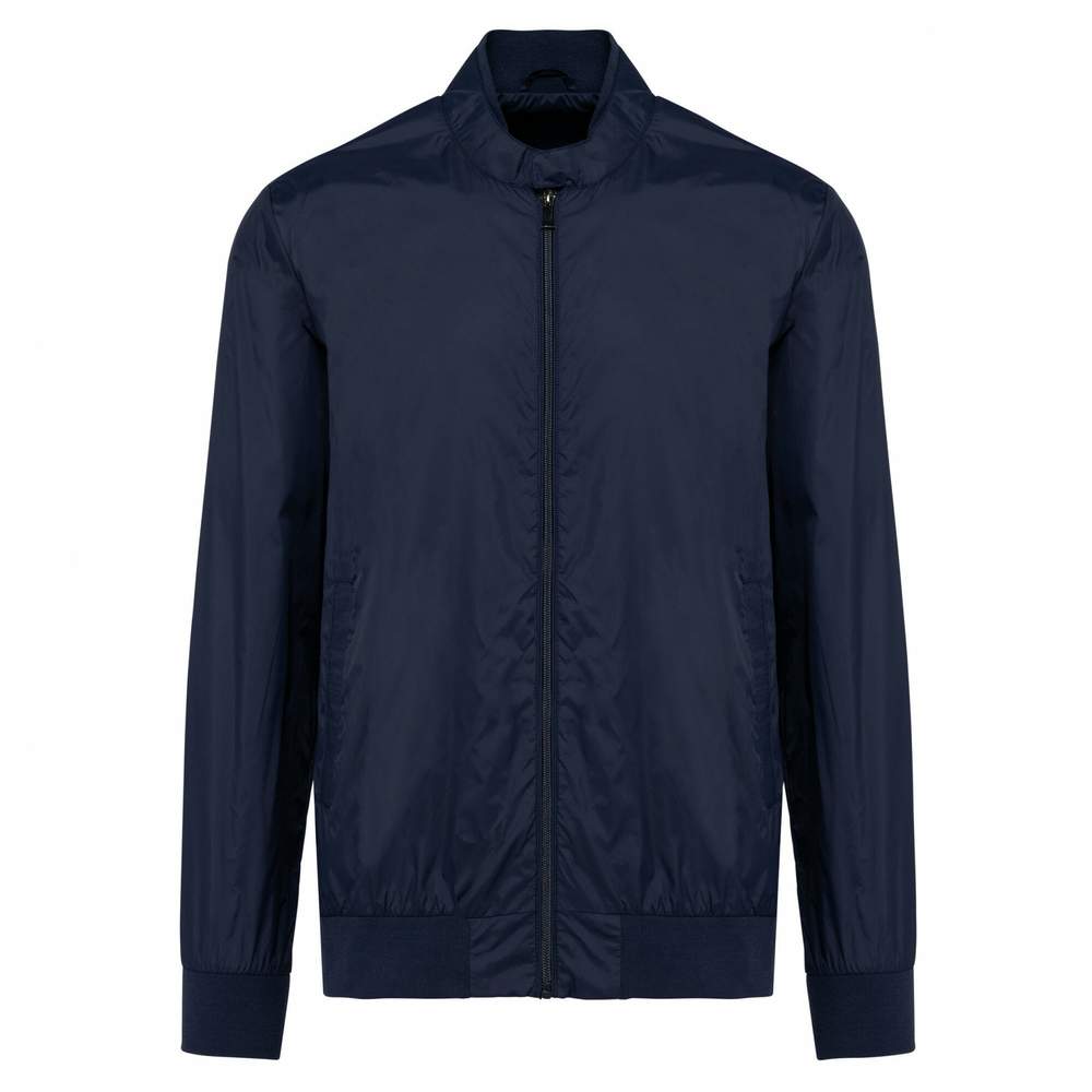 Giacca leggera per uomo. Presenta una chiusura lampo con zip metallico e un bottone a pressione sul colletto. Sono presenti anche tasche laterali con chiusura a bottone a pressione. Il colletto, i polsi e il fondo della giacca sono stretti con un Rib 1x1. Una fibbia è presente all'interno del collo per facilitare l'aggancio della giacca. Le cuciture interne delle maniche e delle spalle sono bordate per una finitura accurata. Una fodera interna volante è presente sulla parte superiore della schiena con un patch per facilitare la personalizzazione. Una cerniera di personalizzazione interna è situata sul lato del petto. La giacca non presenta etichetta del marchio, solo un chip di taglia.
