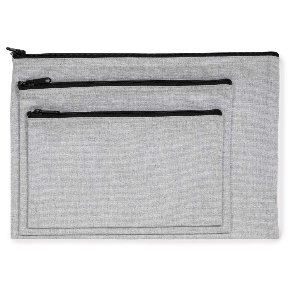 Custodia piatta con chiusura zip, composta da cotone riciclato e poliestere riciclato. Questa custodia è ideale per riporre i tuoi effetti personali durante i tuoi spostamenti o per organizzare le tue cose quotidianamente.