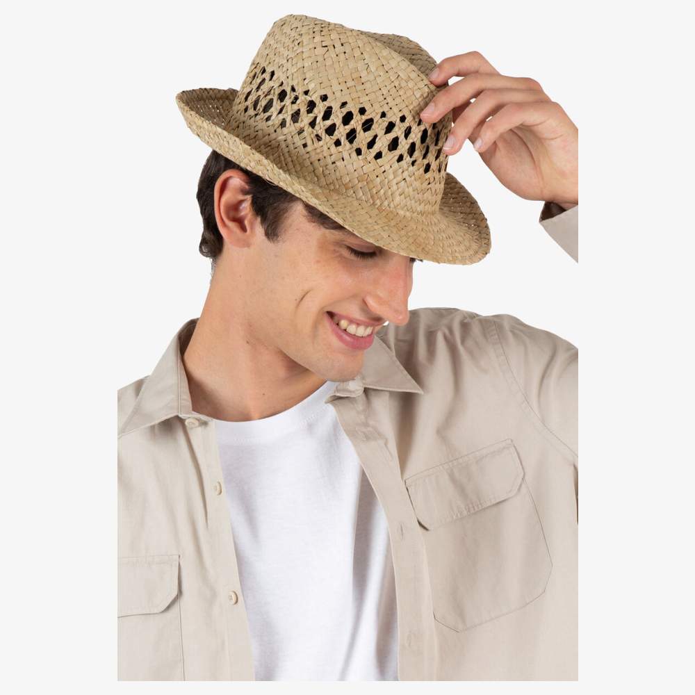 Questo cappello Panama è realizzato in fibra vegetale intrecciata, offrendo un'areazione ottimale. È un accessorio di moda classico, adatto alle giornate di sole. La sua struttura permette una buona circolazione dell'aria, garantendo un comfort apprezzabile. Questo cappello è venduto senza nastro, che può essere ordinato separatamente per una personalizzazione aggiuntiva.