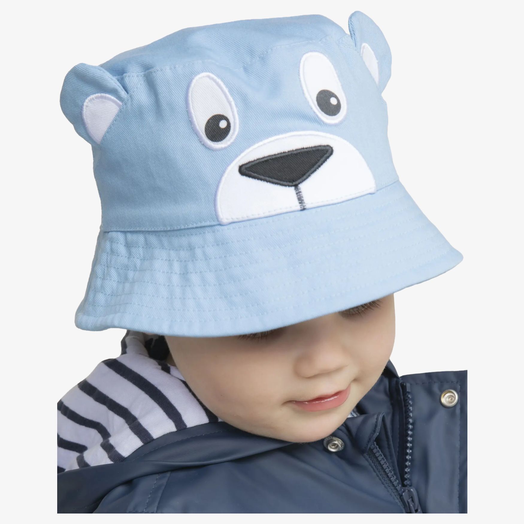 Il Baby Bucket hat è un cappello da pescatore per neonato con parte superiore piatta, bordo cucito e parte posteriore elasticizzata. La parte anteriore presenta due personaggi in stile orso coniglio. La sua forma copre la testa con una tenuta morbida per l'uso quotidiano.