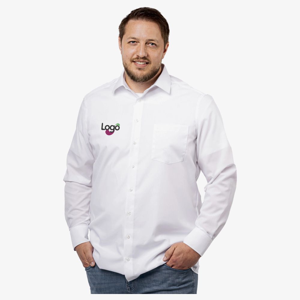 Camicia maniche lunghe, taglio casual. Nuovo colletto Kent. Tasca petto ricamata. Questa camicia in 100% cotone offre comfort ottimale ed eleganza discreta. Ideale per un look casual o professionale, si adatta a tutte le occasioni. La possibilità di personalizzare questa camicia con ricamo ti permette di aggiungere il tuo logo, le tue iniziali o un motivo a tua scelta, per un look unico e personalizzato.